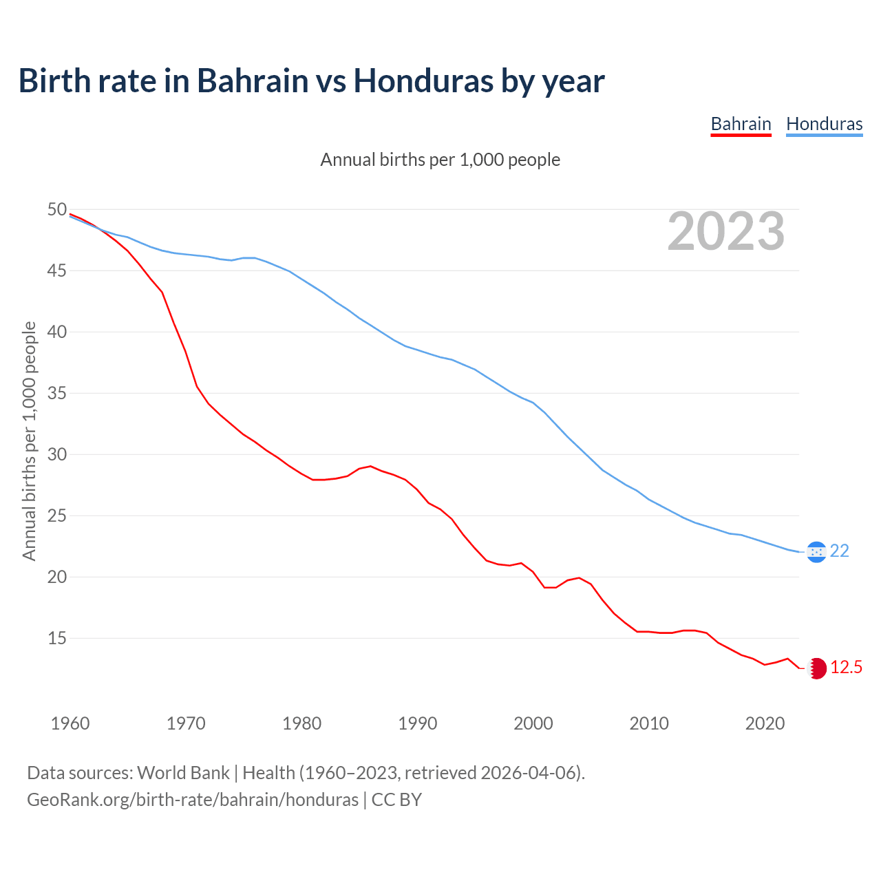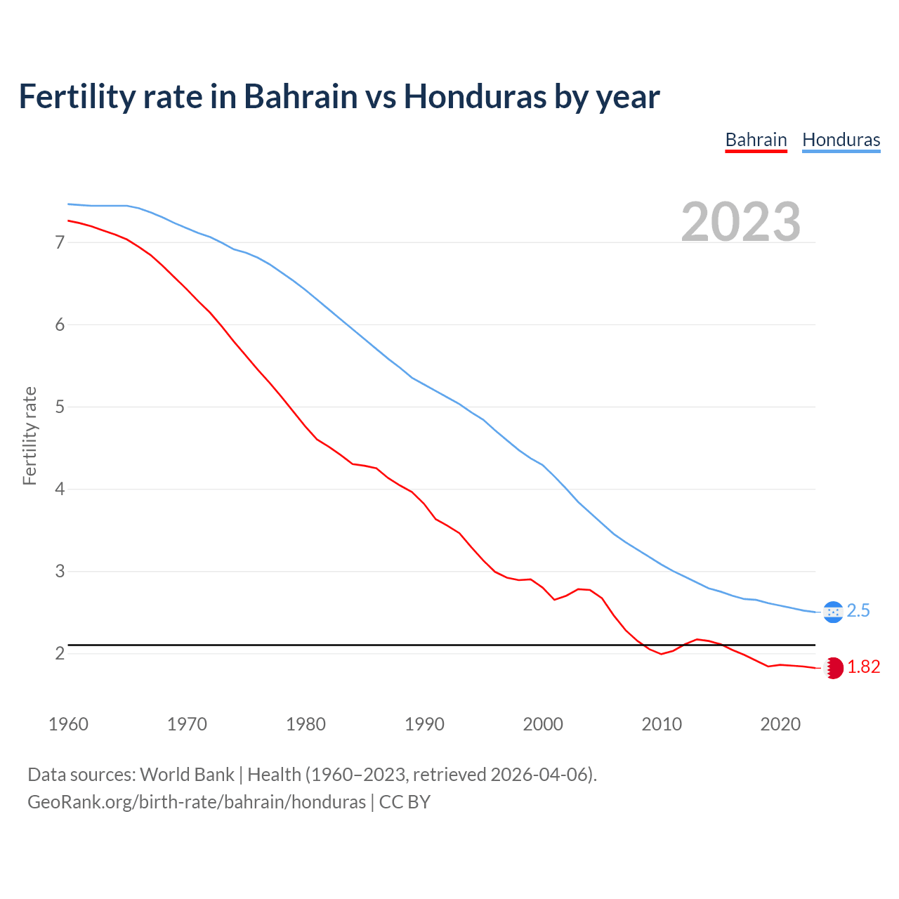 According to the latest available data on birth rates, the fertility rate in Bahrain was 1.82 children per woman in 2023, compared to 2.5 in Honduras in 2023. The replacement level is considered to be 2.1 children per woman.