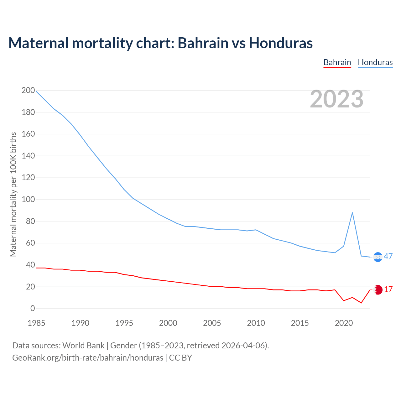 The maternal mortality rate, which is the probability of dying during childbirth or within 42 days of pregnancy termination, is 17 deaths per 100,000 live births in Bahrain, compared to 47 deaths in Honduras.