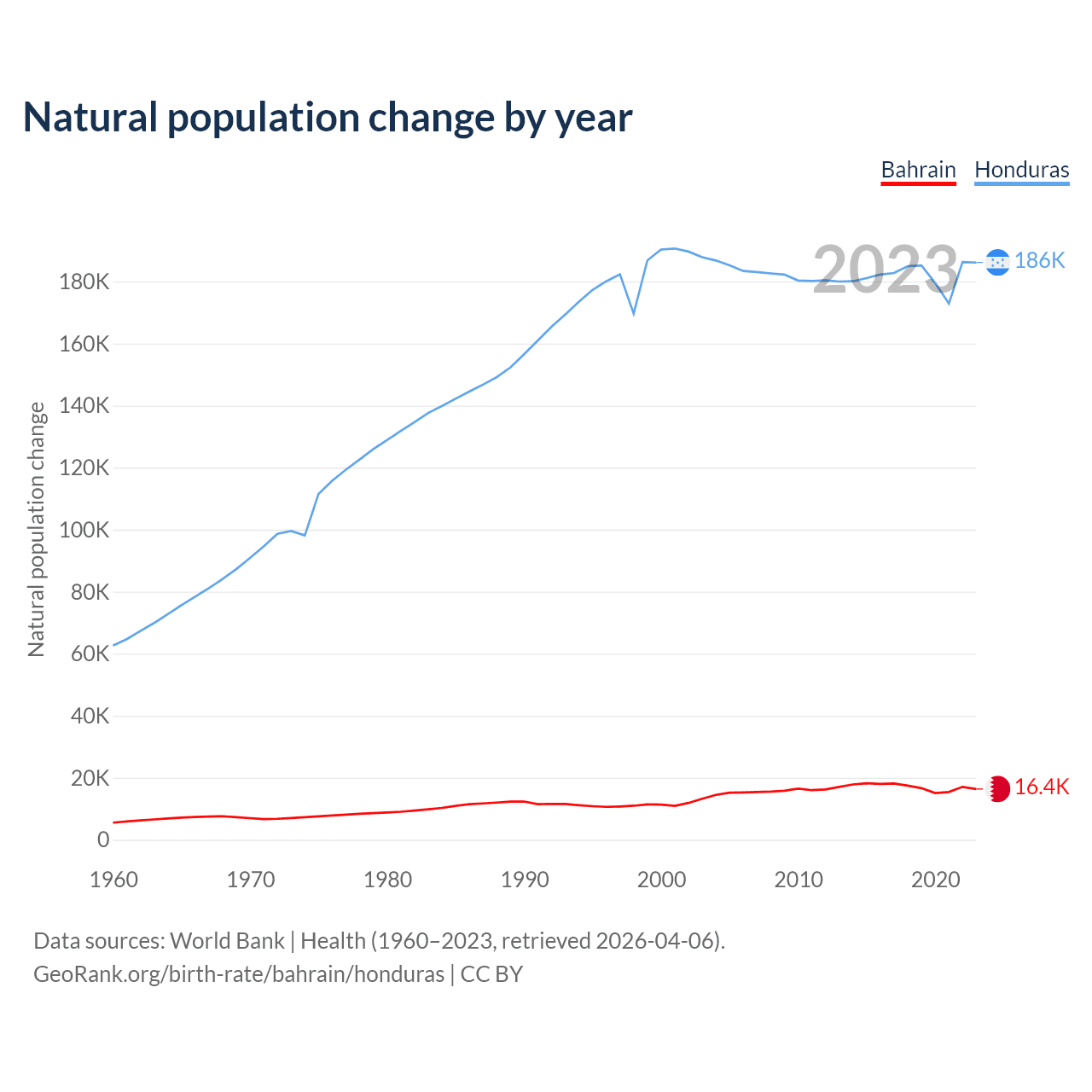 Bahrain has an annual birth rate of 12.5 births per 1,000 people, compared to 22 for Honduras. The average number of children a woman is expected to have during her lifetime — the fertility rate, is 1.82 in Bahrain and 2.5 in Honduras — 37.1% difference.