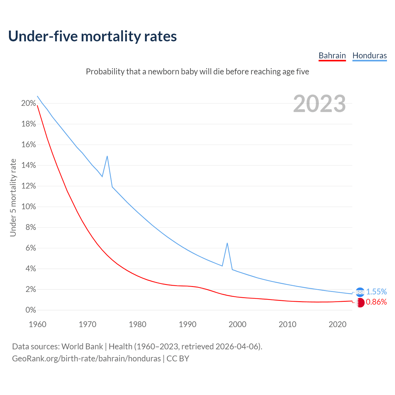 The chance that a newborn baby will die before reaching age five is 0.86% in Bahrain and 1.55% in Honduras. Above is a chart with historical data on under-five mortality rates.