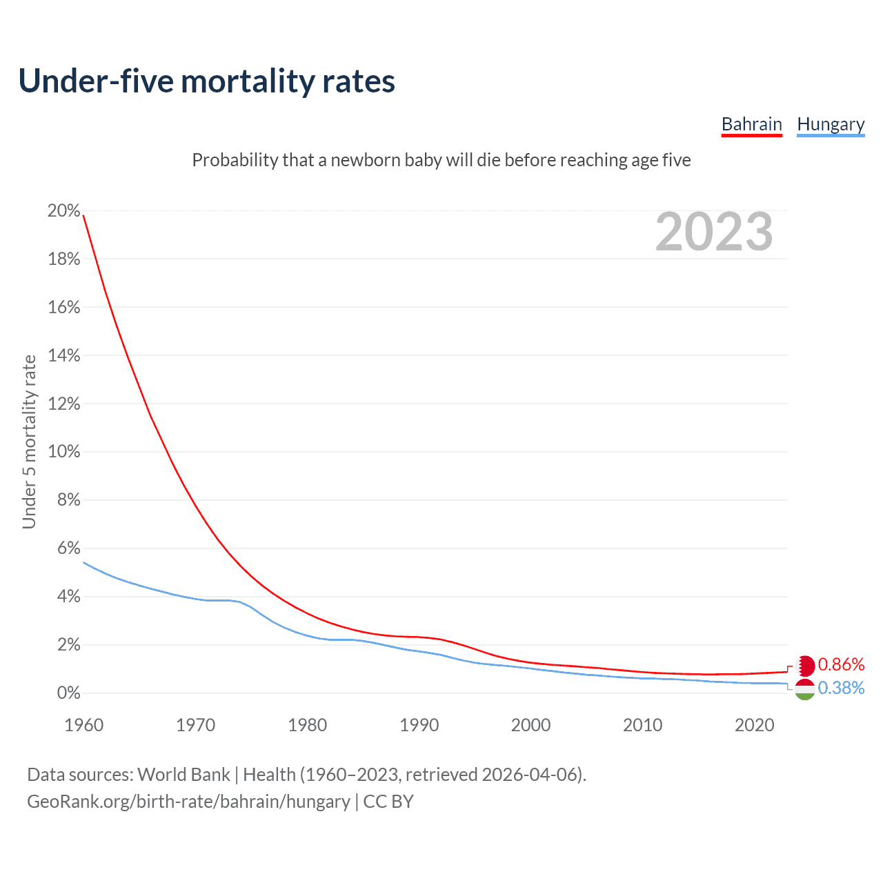 The chance that a newborn baby will die before reaching age five is 0.86% in Bahrain and 0.38% in Hungary. Above is a chart with historical data on under-five mortality rates.