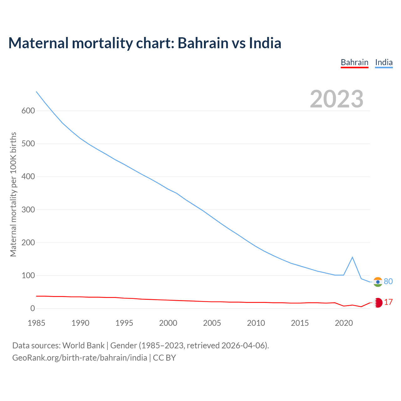 The maternal mortality rate, which is the probability of dying during childbirth or within 42 days of pregnancy termination, is 17 deaths per 100,000 live births in Bahrain, compared to 80 deaths in India.
