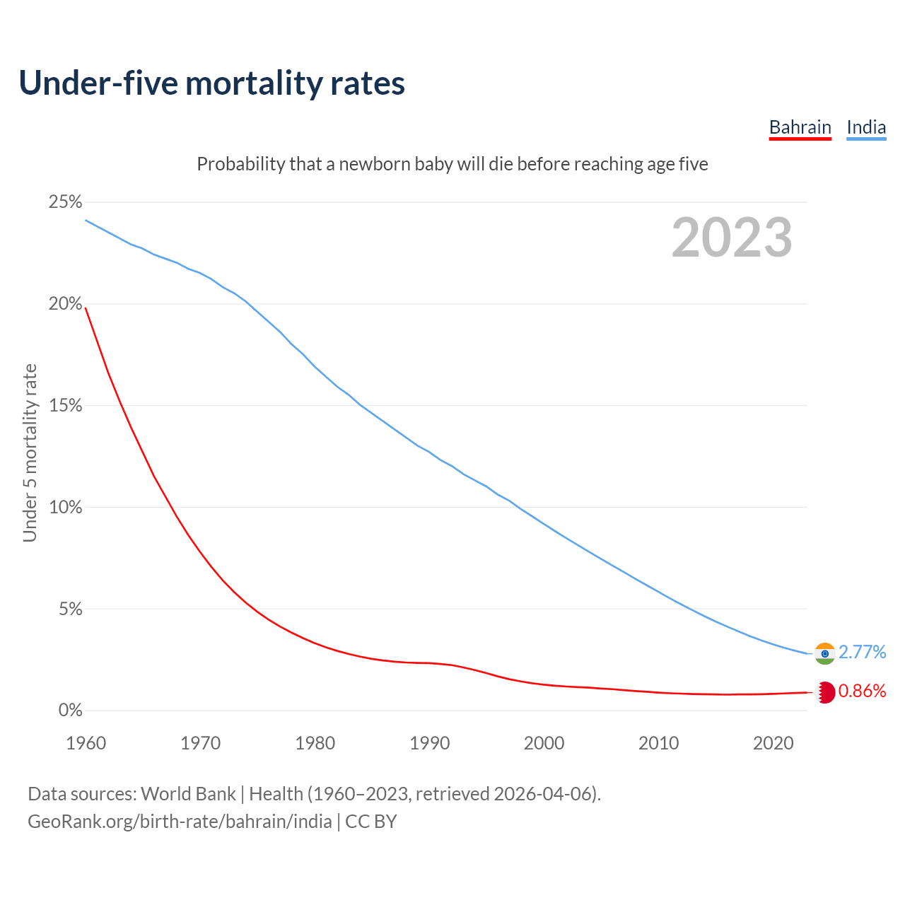 The chance that a newborn baby will die before reaching age five is 0.86% in Bahrain and 2.77% in India. Above is a chart with historical data on under-five mortality rates.