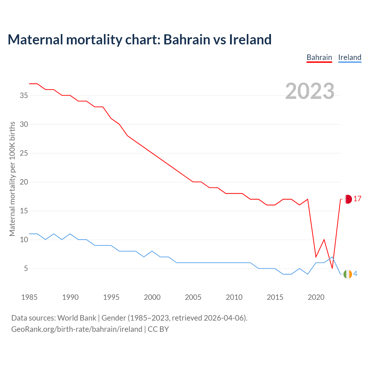 The maternal mortality rate, which is the probability of dying during childbirth or within 42 days of pregnancy termination, is 17 deaths per 100,000 live births in Bahrain, compared to 4 deaths in Ireland.