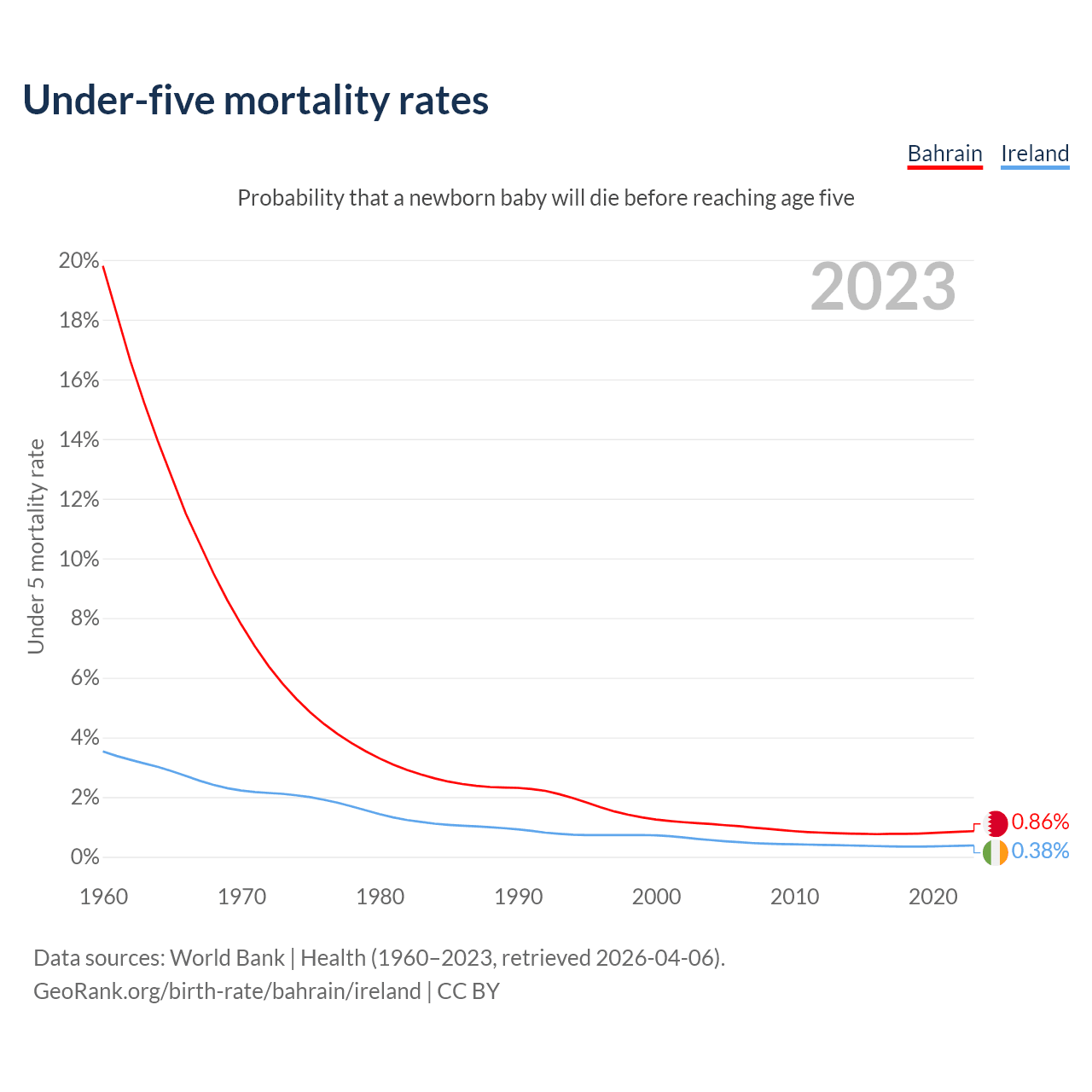 The chance that a newborn baby will die before reaching age five is 0.86% in Bahrain and 0.38% in Ireland. Above is a chart with historical data on under-five mortality rates.