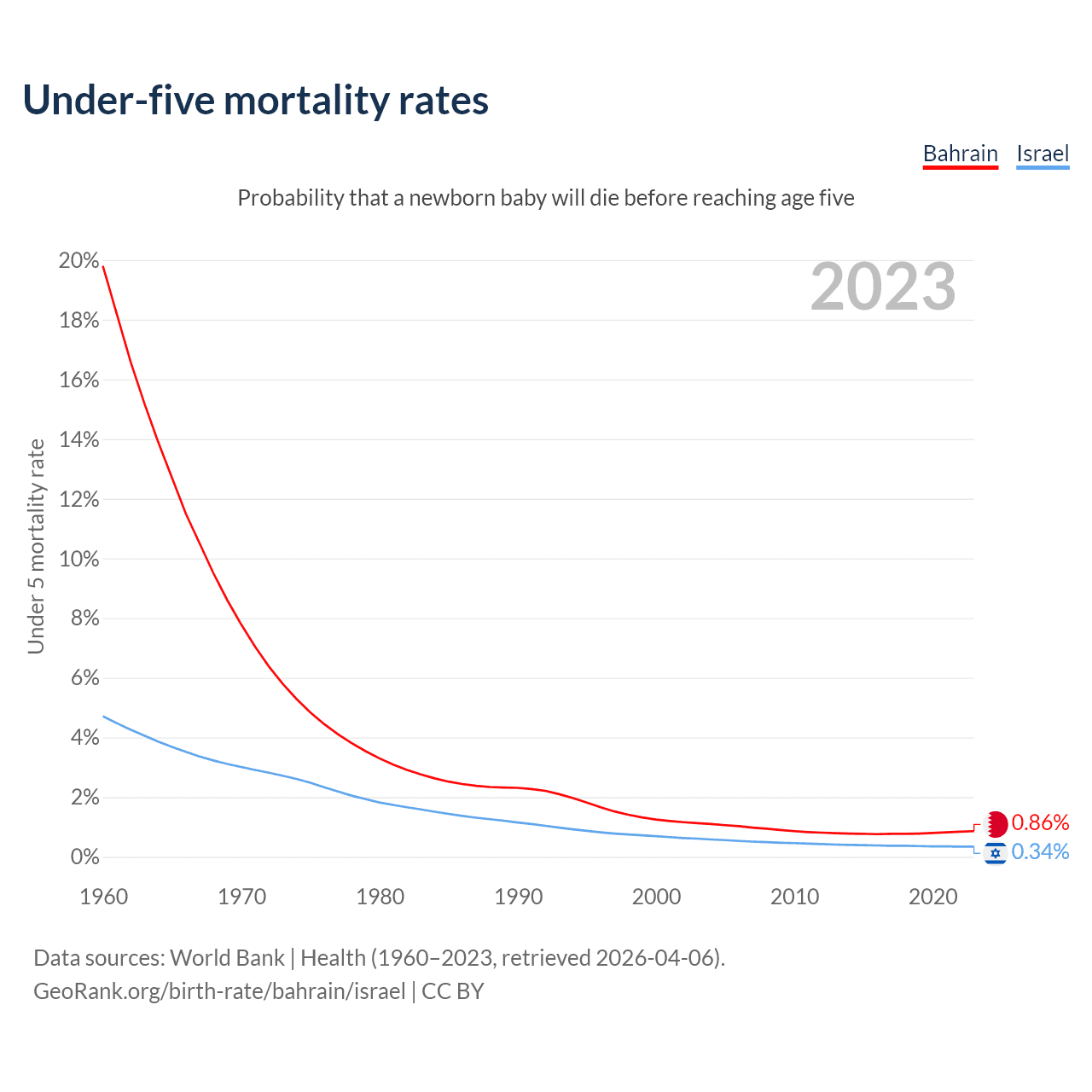 The chance that a newborn baby will die before reaching age five is 0.86% in Bahrain and 0.34% in Israel. Above is a chart with historical data on under-five mortality rates.
