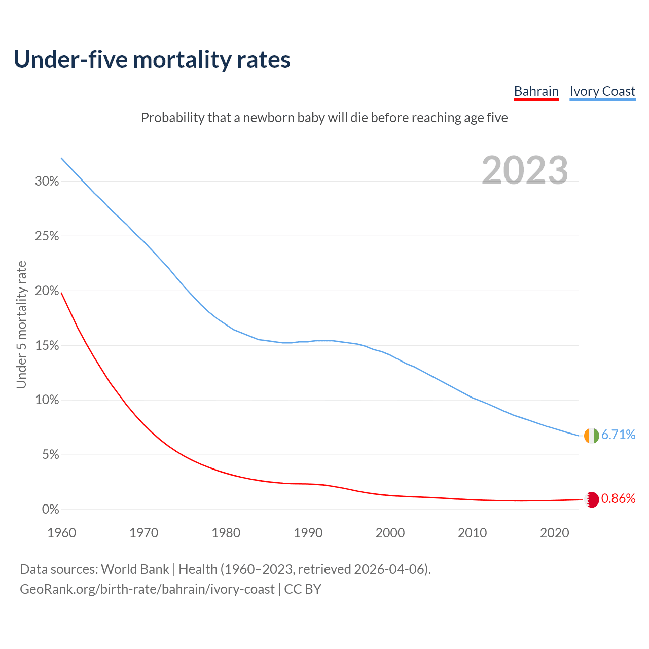 The chance that a newborn baby will die before reaching age five is 0.86% in Bahrain and 6.71% in Ivory Coast. Above is a chart with historical data on under-five mortality rates.