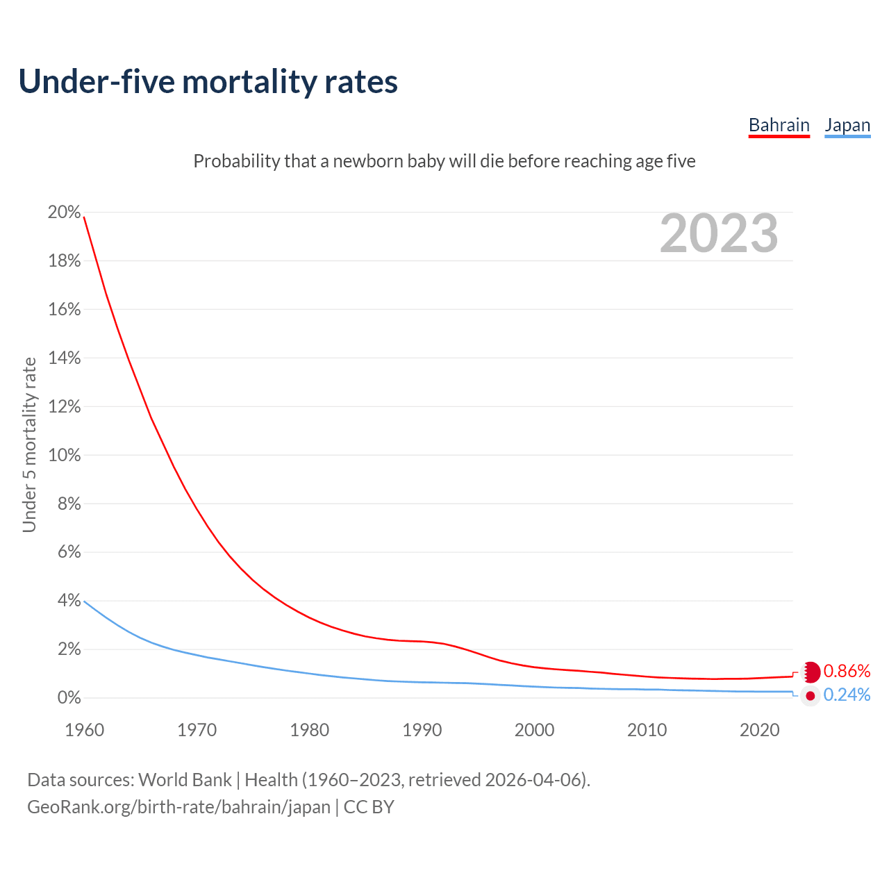 The chance that a newborn baby will die before reaching age five is 0.86% in Bahrain and 0.24% in Japan. Above is a chart with historical data on under-five mortality rates.
