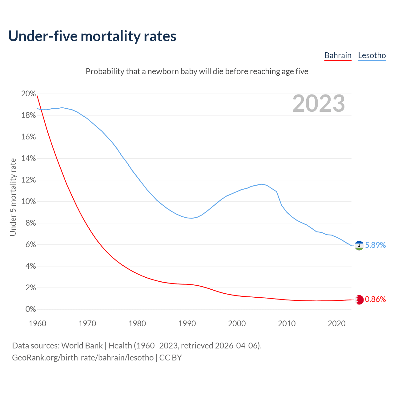 The chance that a newborn baby will die before reaching age five is 0.86% in Bahrain and 5.89% in Lesotho. Above is a chart with historical data on under-five mortality rates.