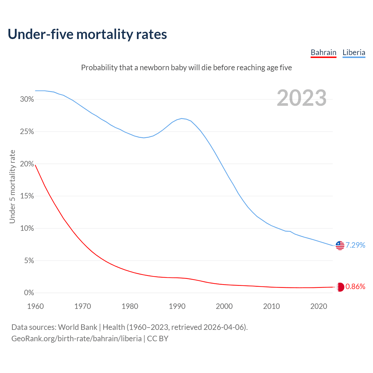 The chance that a newborn baby will die before reaching age five is 0.86% in Bahrain and 7.29% in Liberia. Above is a chart with historical data on under-five mortality rates.