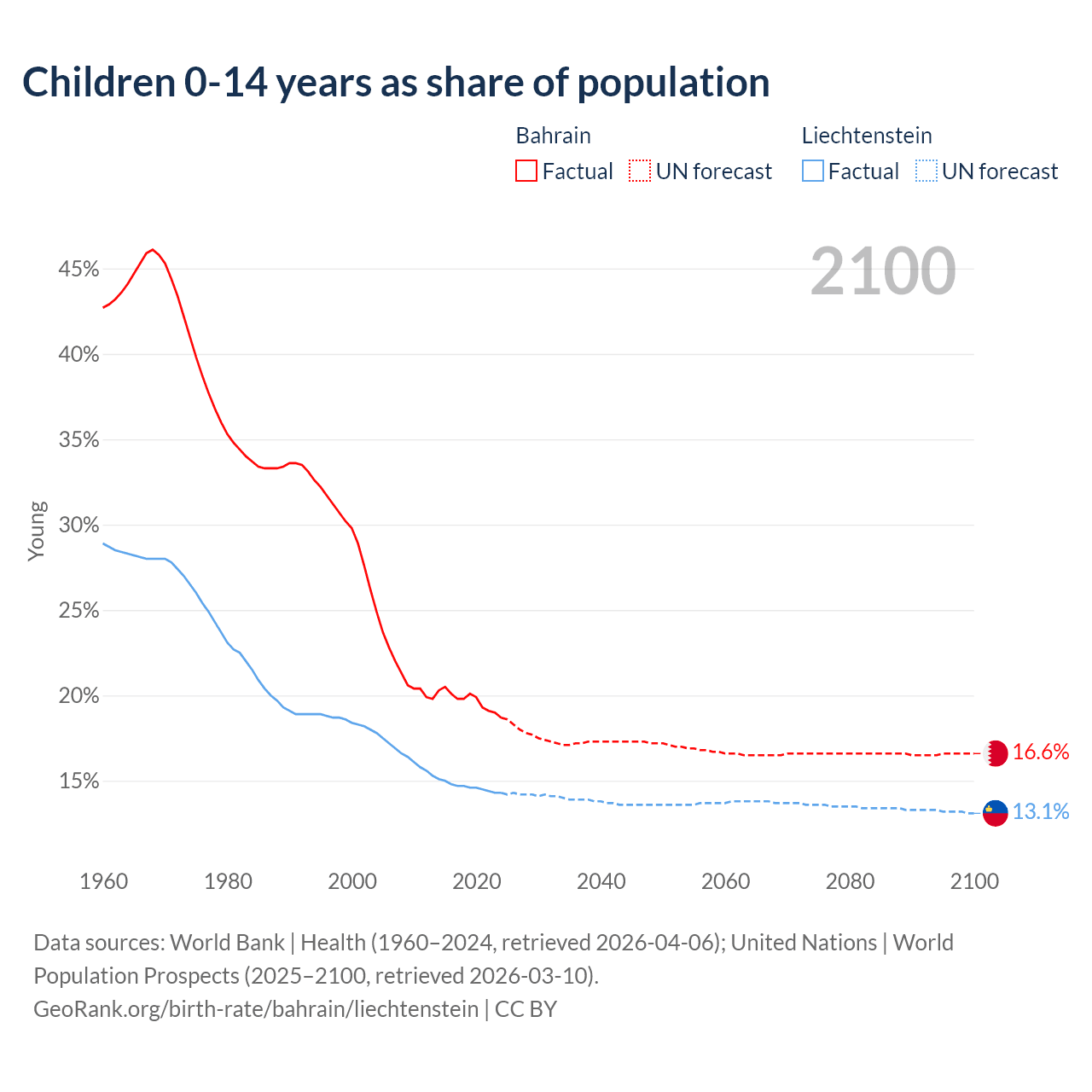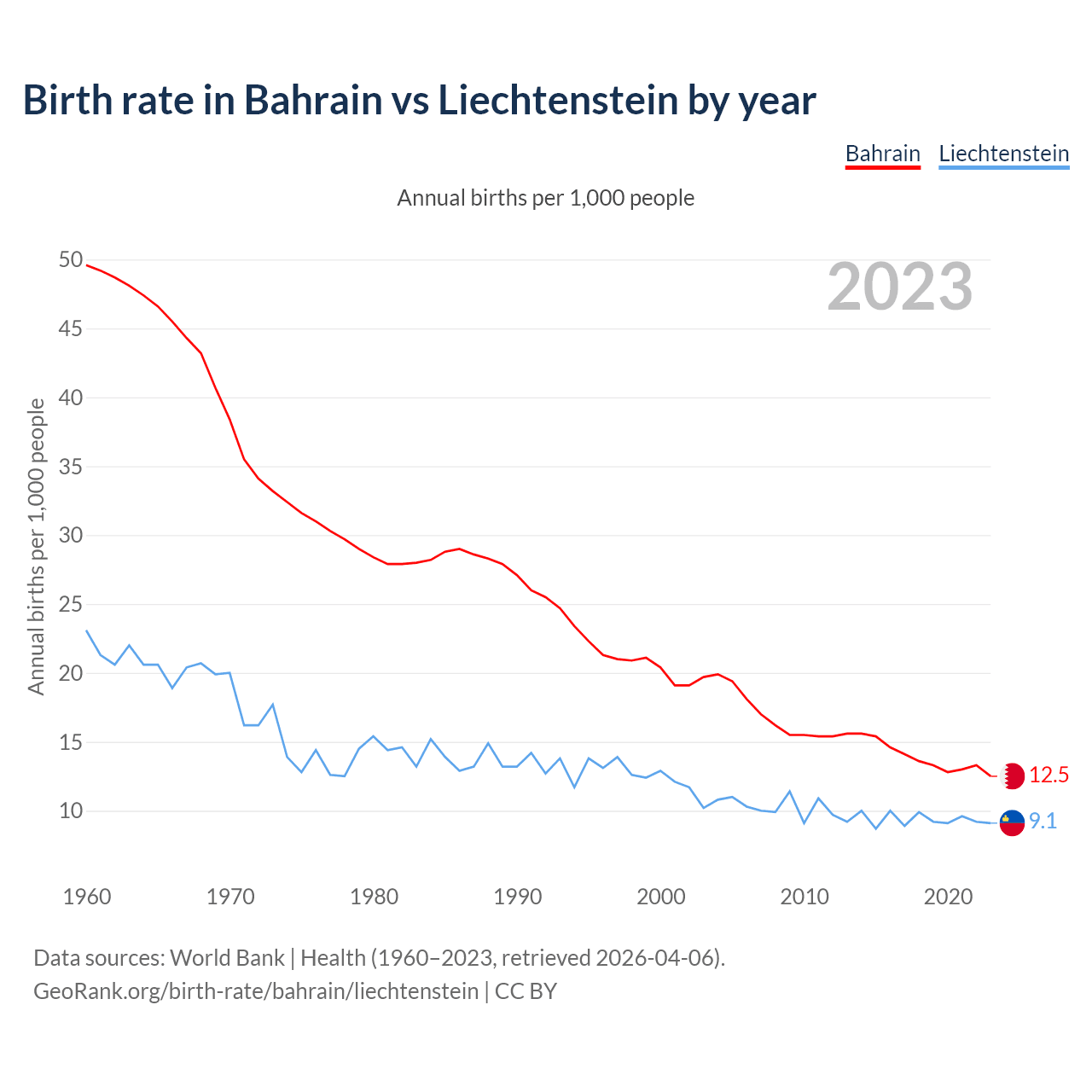 According to the latest available data on birth rates, the fertility rate in Bahrain was 1.82 children per woman in 2023, compared to 1.45 in Liechtenstein in 2023. The replacement level is considered to be 2.1 children per woman.