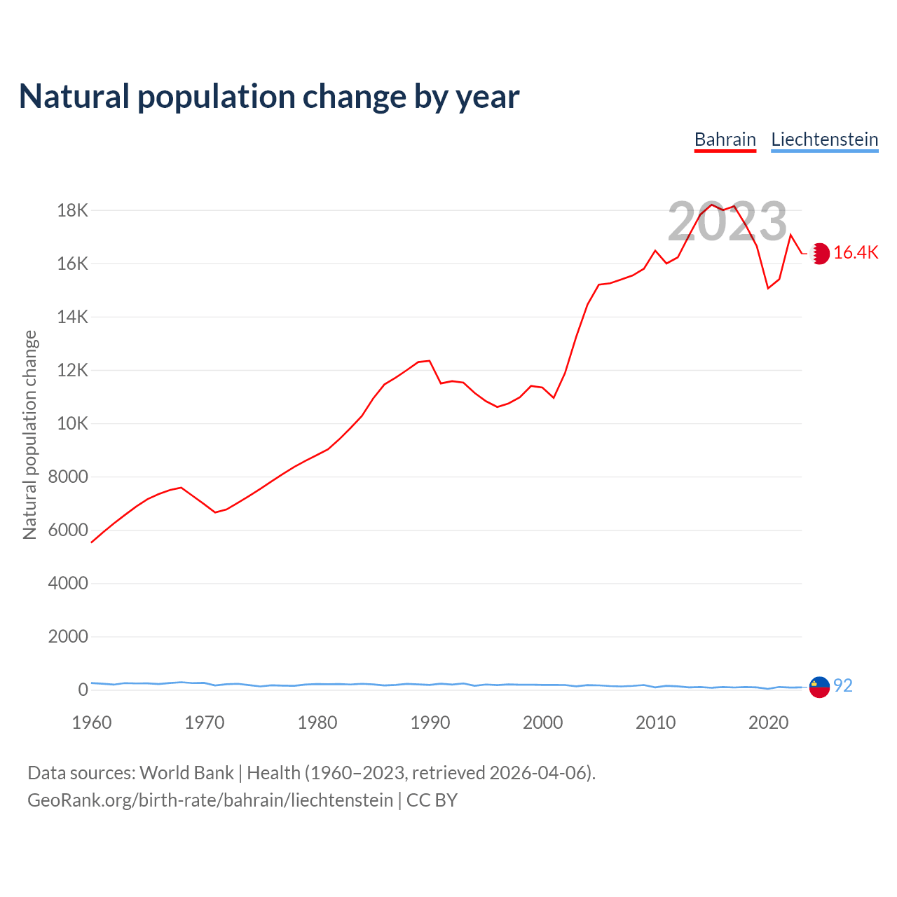 Bahrain has an annual birth rate of 12.5 births per 1,000 people, compared to 9.1 for Liechtenstein. The average number of children a woman is expected to have during her lifetime — the fertility rate, is 1.82 in Bahrain and 1.45 in Liechtenstein — 20.5% difference.