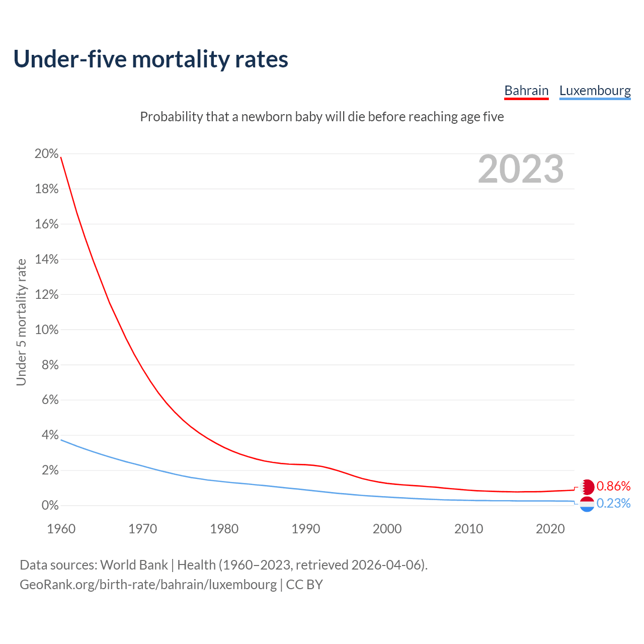 The chance that a newborn baby will die before reaching age five is 0.86% in Bahrain and 0.23% in Luxembourg. Above is a chart with historical data on under-five mortality rates.