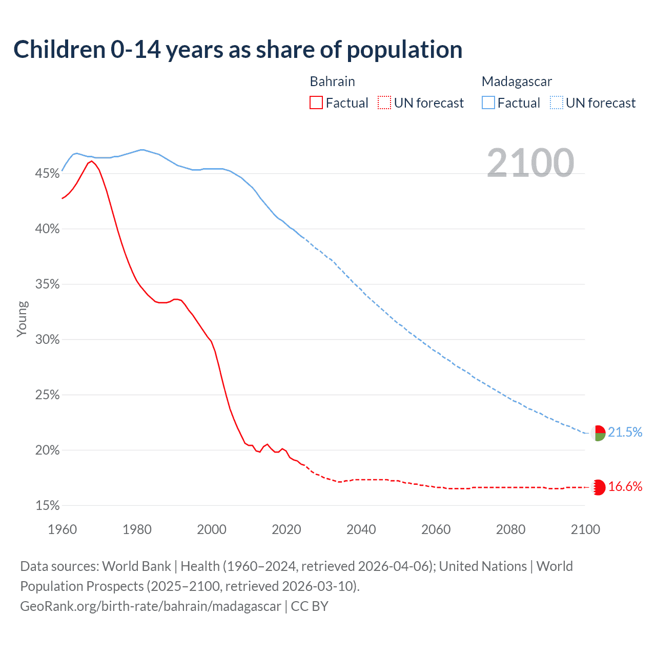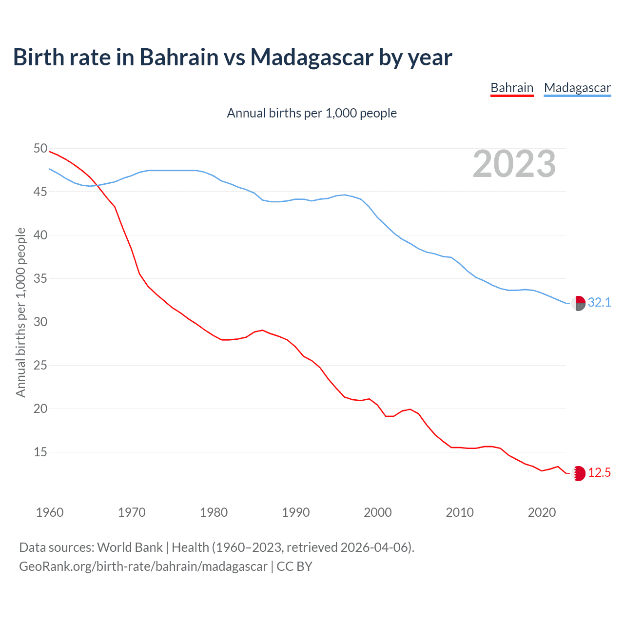 Bahrain has an annual birth rate of 12.5 births per 1,000 people, compared to 32.1 for Madagascar. The average number of children a woman is expected to have during her lifetime — the fertility rate, is 1.82 in Bahrain and 3.97 in Madagascar — 117.8% difference.