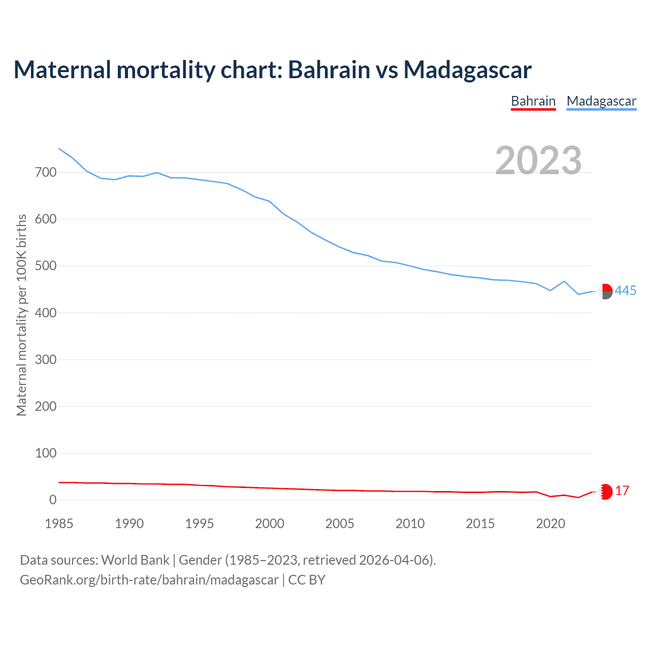 The maternal mortality rate, which is the probability of dying during childbirth or within 42 days of pregnancy termination, is 17 deaths per 100,000 live births in Bahrain, compared to 445 deaths in Madagascar.