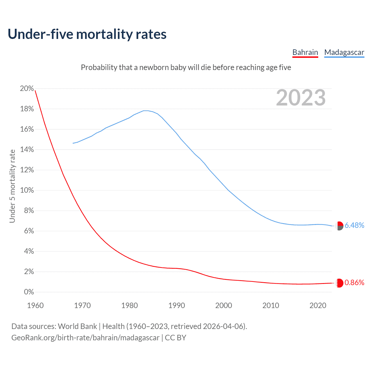 The chance that a newborn baby will die before reaching age five is 0.86% in Bahrain and 6.48% in Madagascar. Above is a chart with historical data on under-five mortality rates.