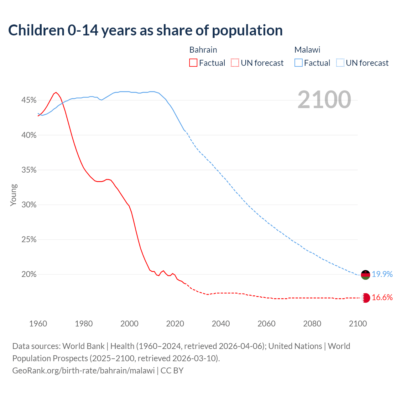 According to the latest available data on birth rates, the fertility rate in Bahrain was 1.82 children per woman in 2023, compared to 3.65 in Malawi in 2023. The replacement level is considered to be 2.1 children per woman.