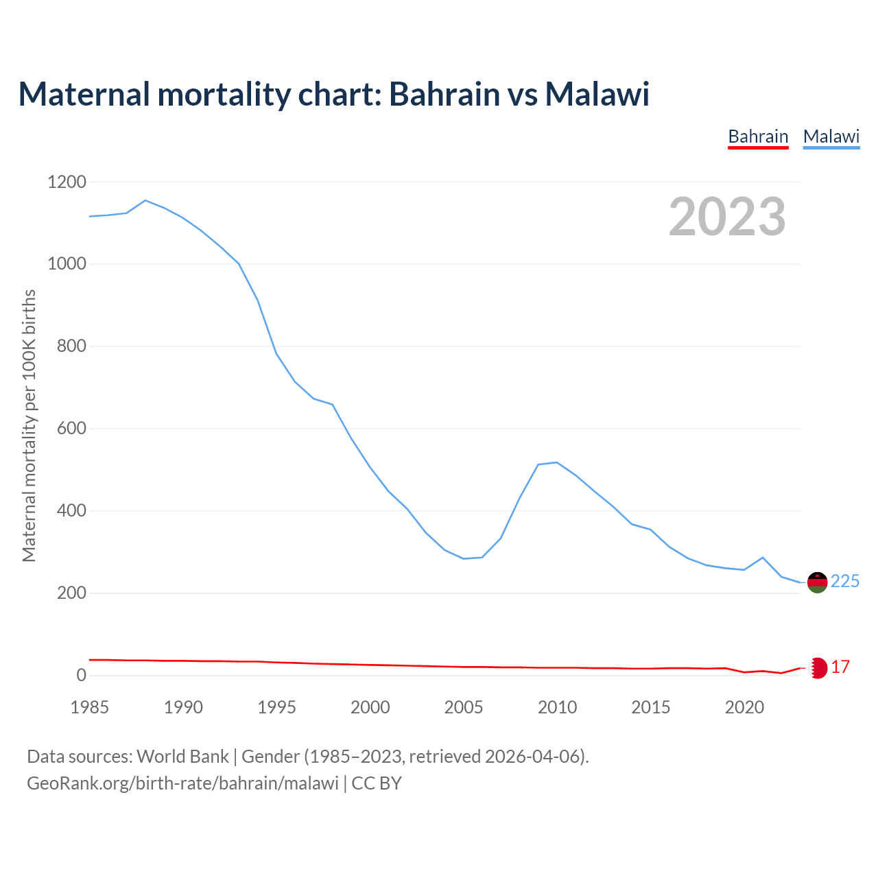The maternal mortality rate, which is the probability of dying during childbirth or within 42 days of pregnancy termination, is 17 deaths per 100,000 live births in Bahrain, compared to 225 deaths in Malawi.