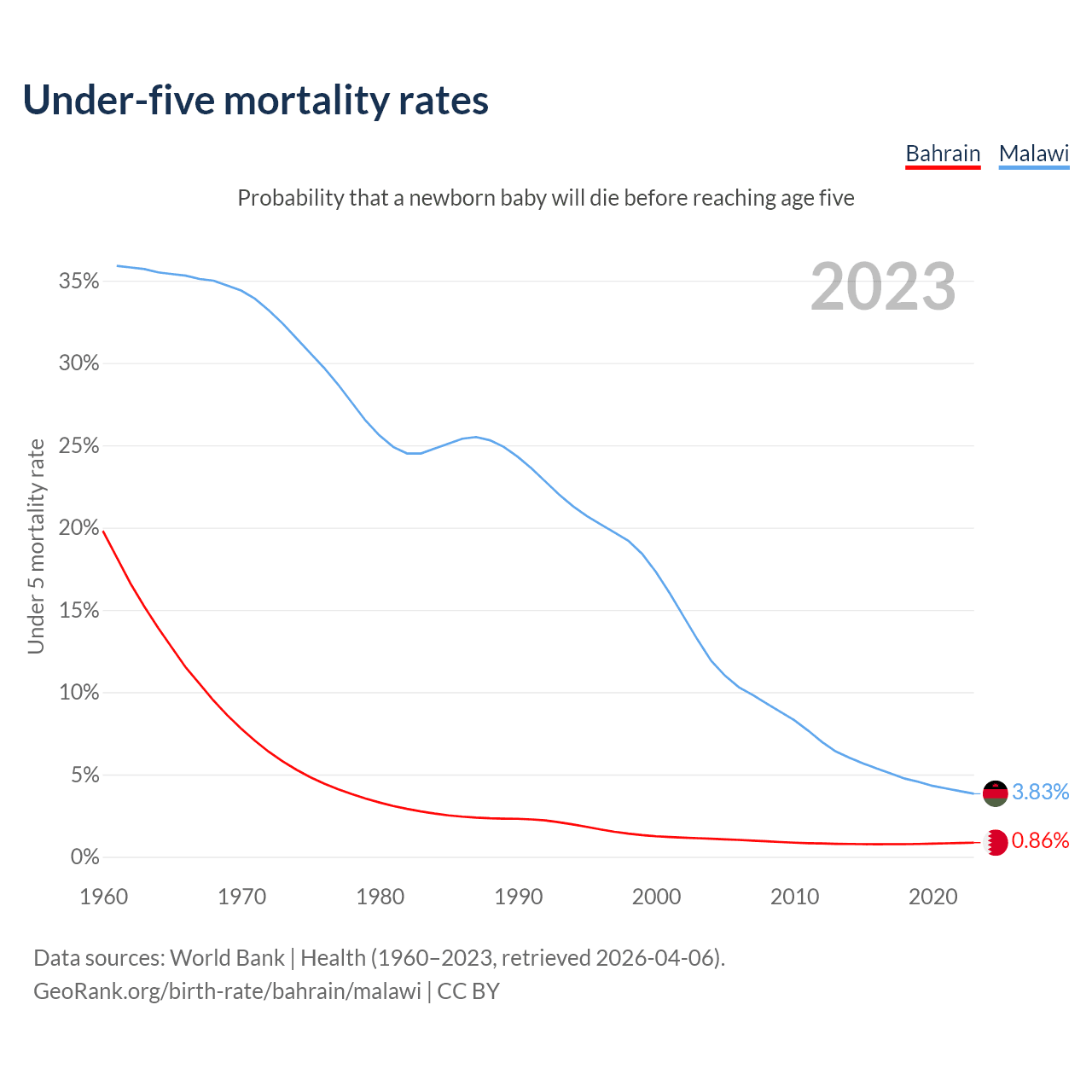 The chance that a newborn baby will die before reaching age five is 0.86% in Bahrain and 3.83% in Malawi. Above is a chart with historical data on under-five mortality rates.