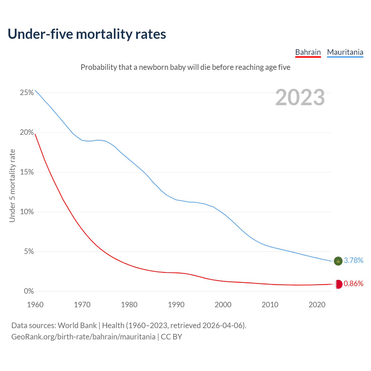 The chance that a newborn baby will die before reaching age five is 0.86% in Bahrain and 3.78% in Mauritania. Above is a chart with historical data on under-five mortality rates.