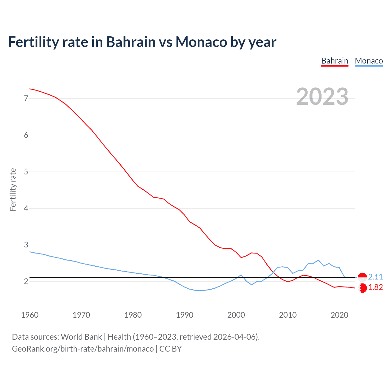 1960 vs 2023, the fertility rate has decreased by 74.9% in Bahrain and by 25% in Monaco — in 1960, it was 7.26 and 2.81, respectively.