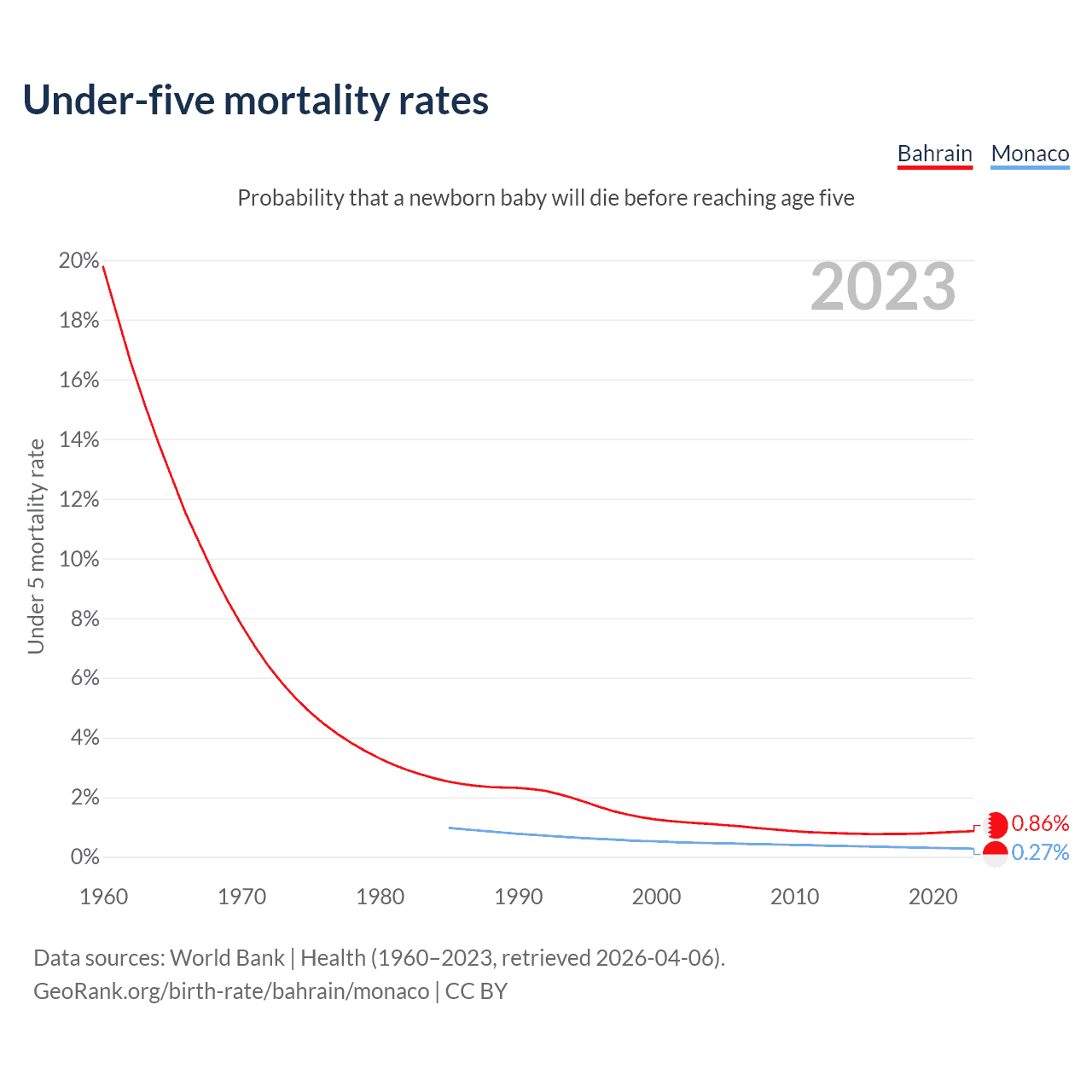 The chance that a newborn baby will die before reaching age five is 0.86% in Bahrain and 0.27% in Monaco. Above is a chart with historical data on under-five mortality rates.