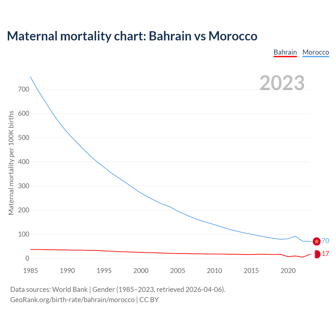 The maternal mortality rate, which is the probability of dying during childbirth or within 42 days of pregnancy termination, is 17 deaths per 100,000 live births in Bahrain, compared to 70 deaths in Morocco.
