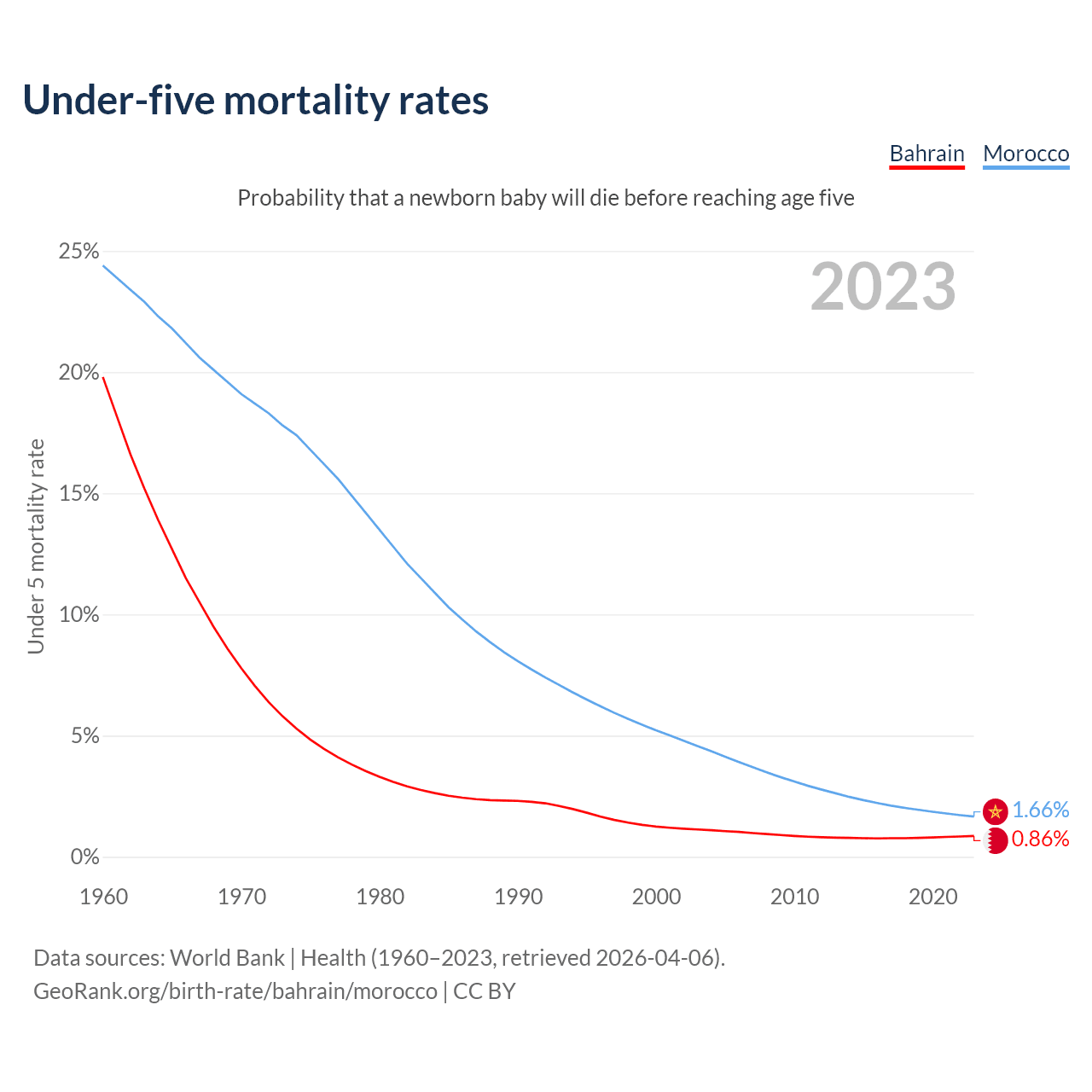 The chance that a newborn baby will die before reaching age five is 0.86% in Bahrain and 1.66% in Morocco. Above is a chart with historical data on under-five mortality rates.