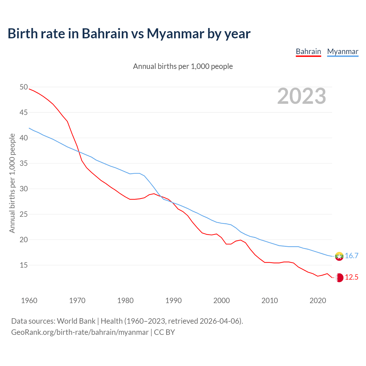 Bahrain has an annual birth rate of 12.5 births per 1,000 people, compared to 16.7 for Myanmar. The average number of children a woman is expected to have during her lifetime — the fertility rate, is 1.82 in Bahrain and 2.12 in Myanmar — 16% difference.