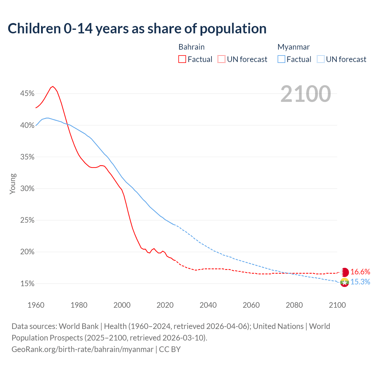 According to the latest available data on birth rates, the fertility rate in Bahrain was 1.82 children per woman in 2023, compared to 2.12 in Myanmar in 2023. The replacement level is considered to be 2.1 children per woman.