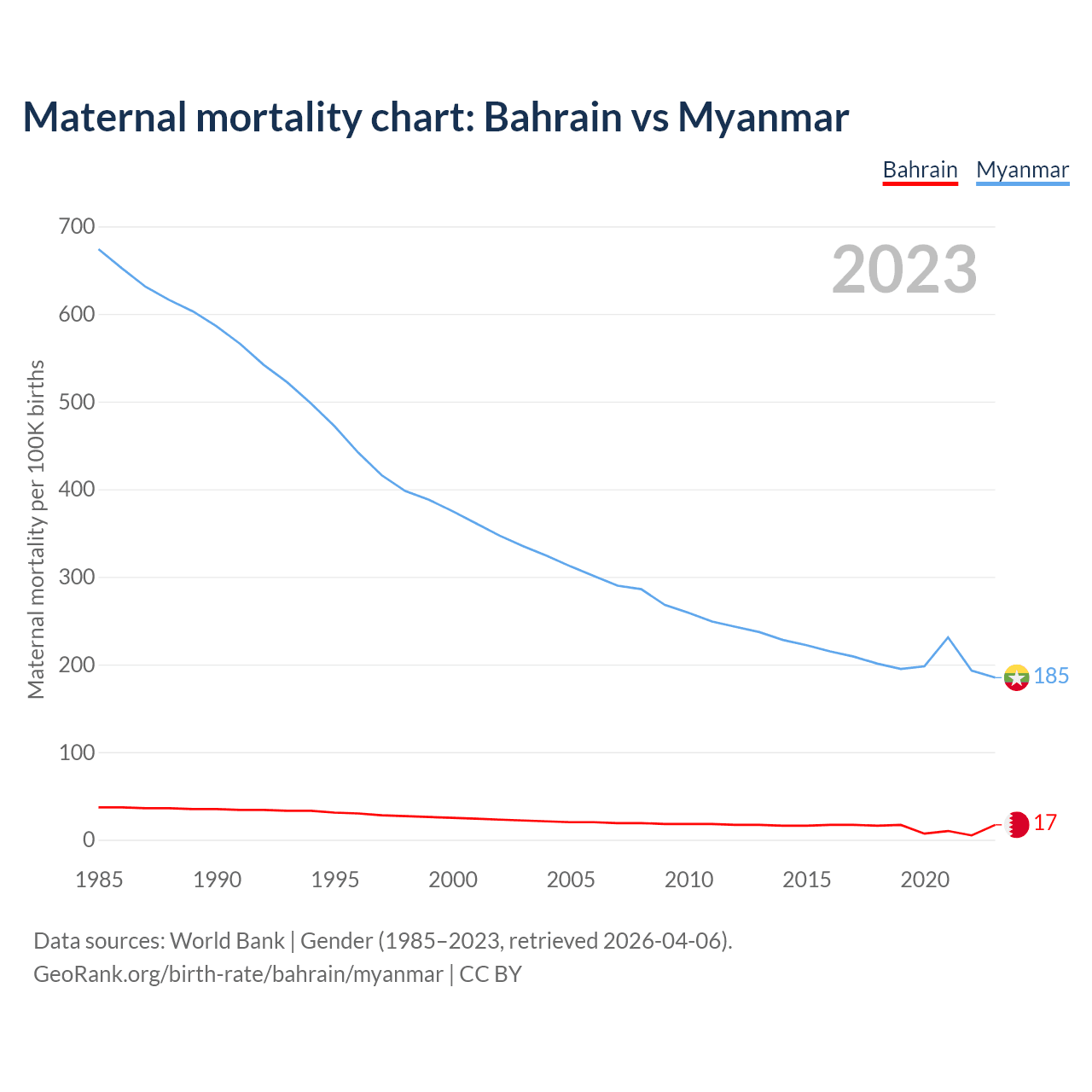 The maternal mortality rate, which is the probability of dying during childbirth or within 42 days of pregnancy termination, is 17 deaths per 100,000 live births in Bahrain, compared to 185 deaths in Myanmar.