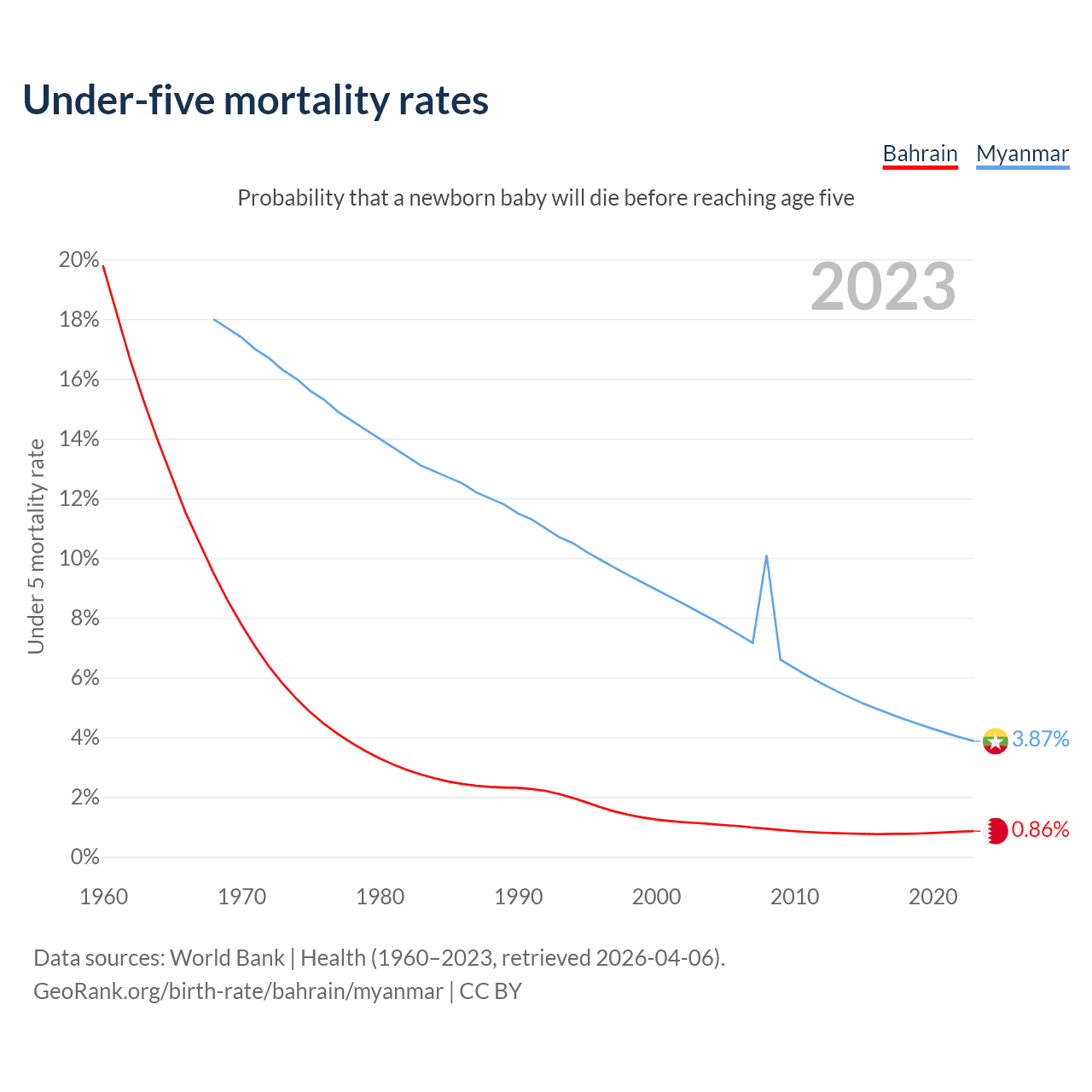The chance that a newborn baby will die before reaching age five is 0.86% in Bahrain and 3.87% in Myanmar. Above is a chart with historical data on under-five mortality rates.