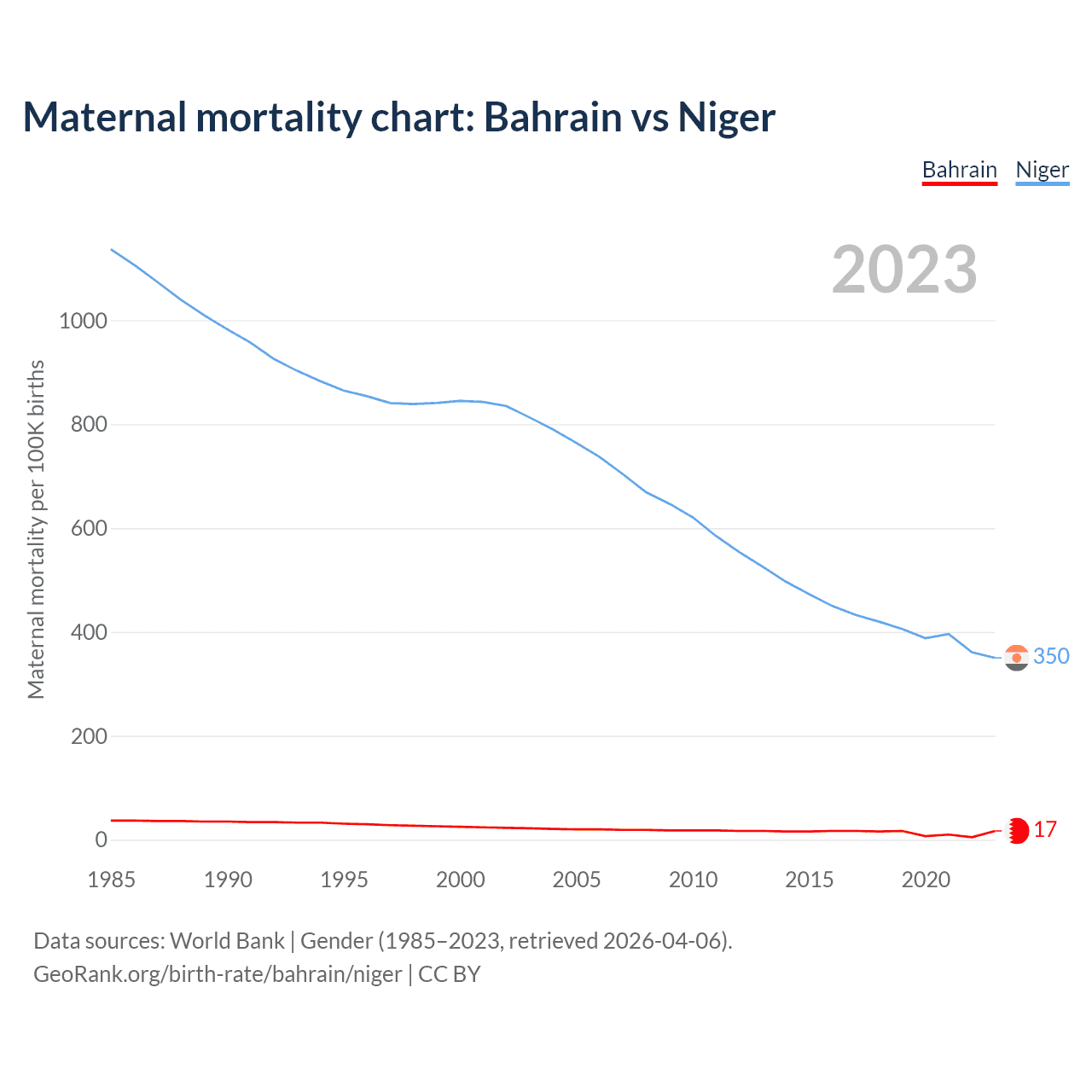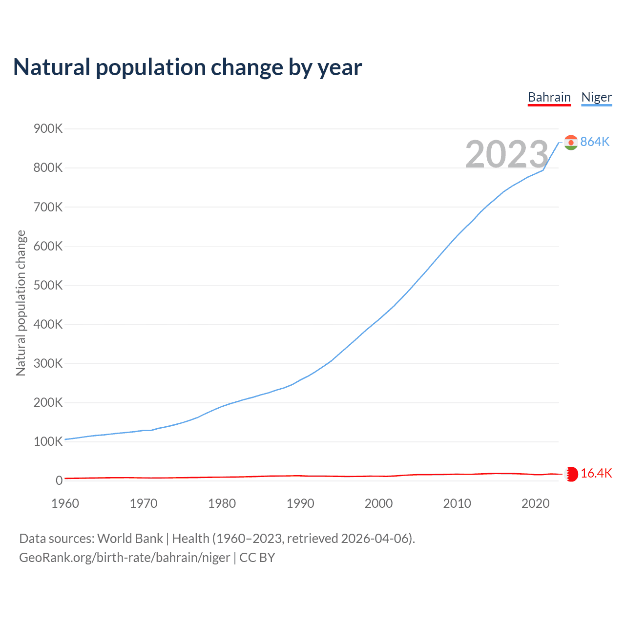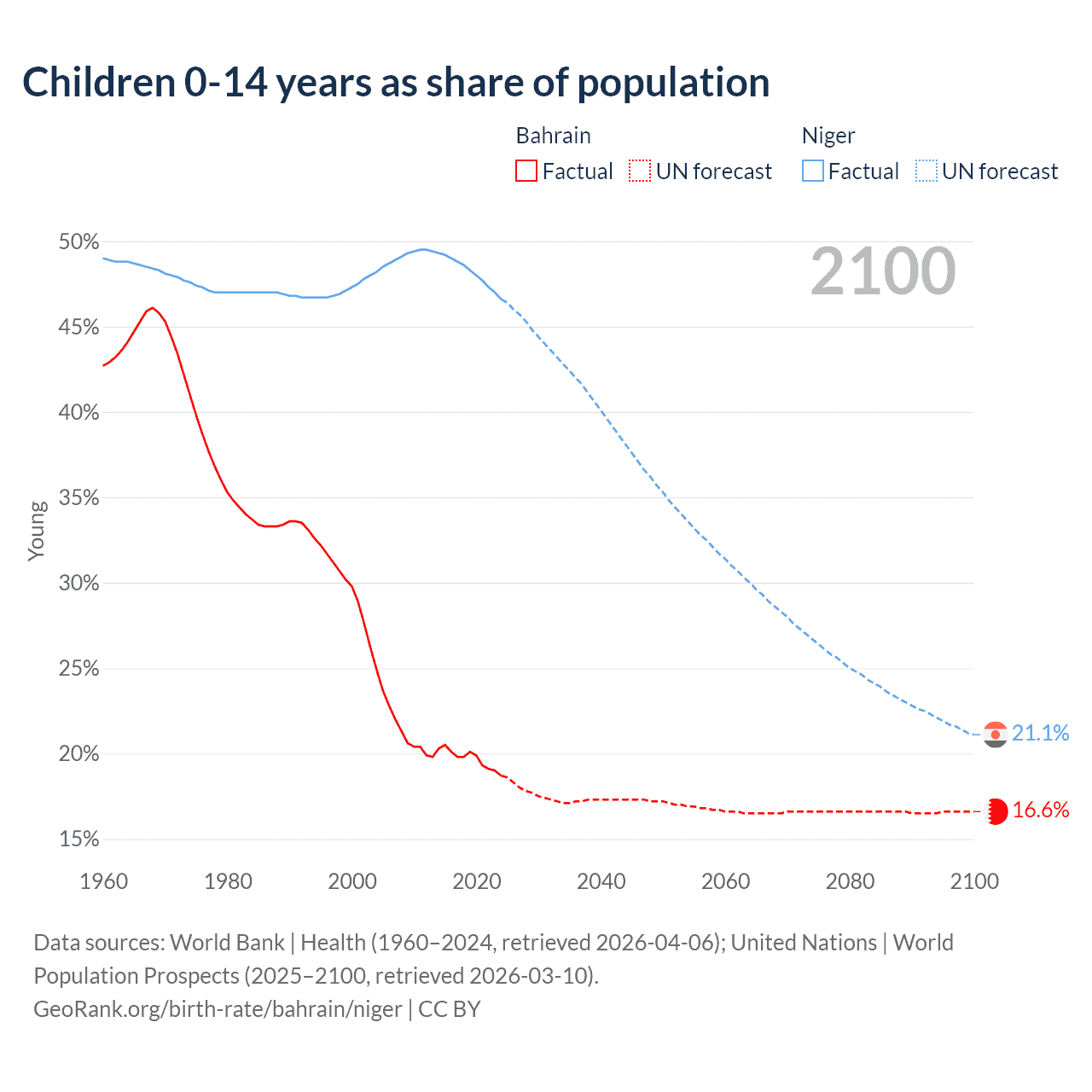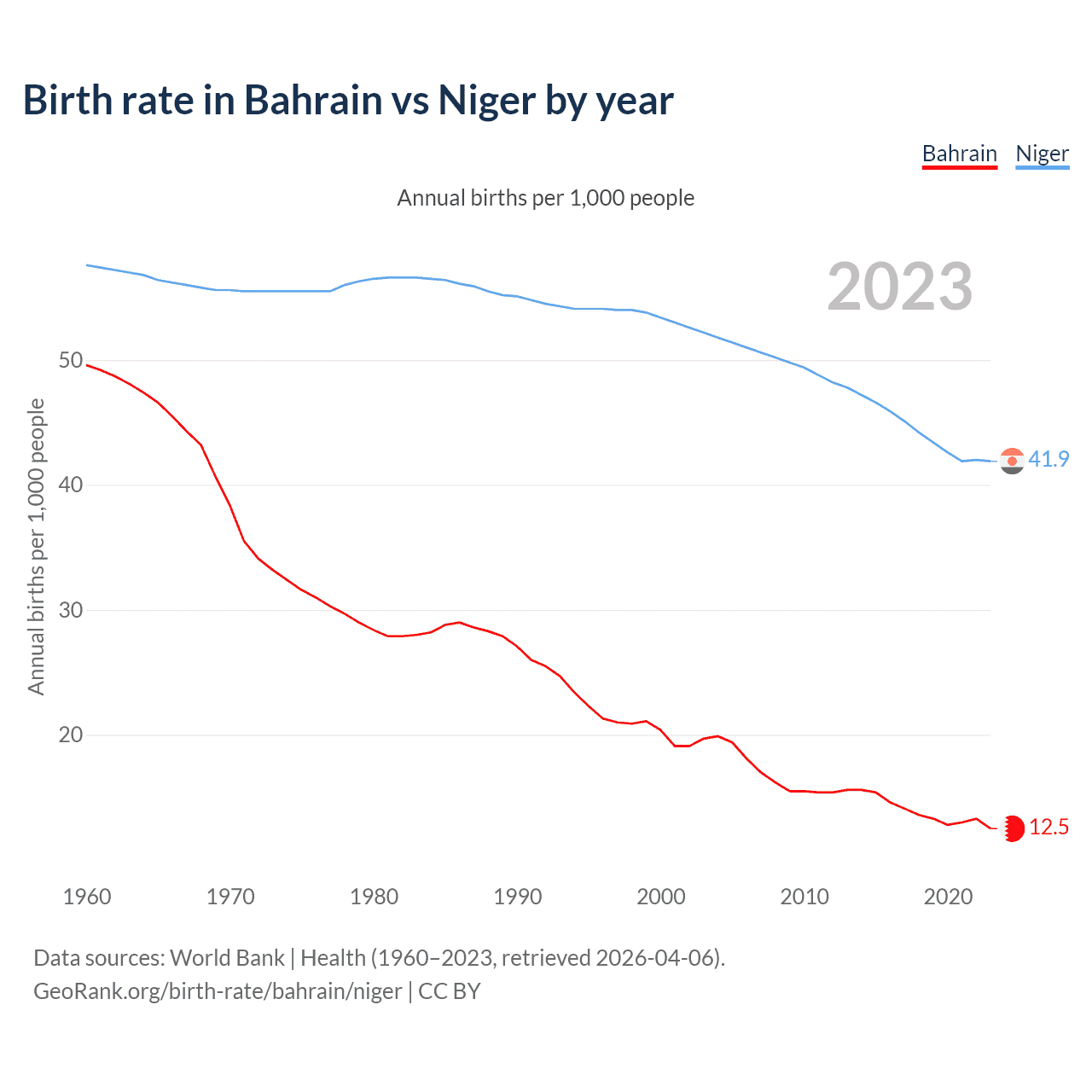 Bahrain has an annual birth rate of 12.5 births per 1,000 people, compared to 41.9 for Niger. The average number of children a woman is expected to have during her lifetime — the fertility rate, is 1.82 in Bahrain and 6.06 in Niger — 232.3% difference.