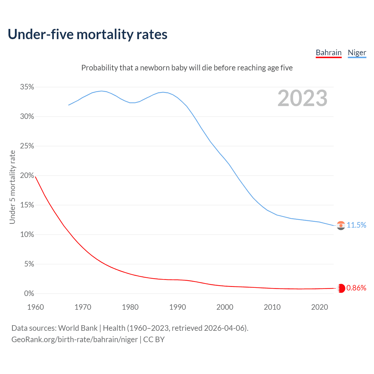 The chance that a newborn baby will die before reaching age five is 0.86% in Bahrain and 11.5% in Niger. Above is a chart with historical data on under-five mortality rates.