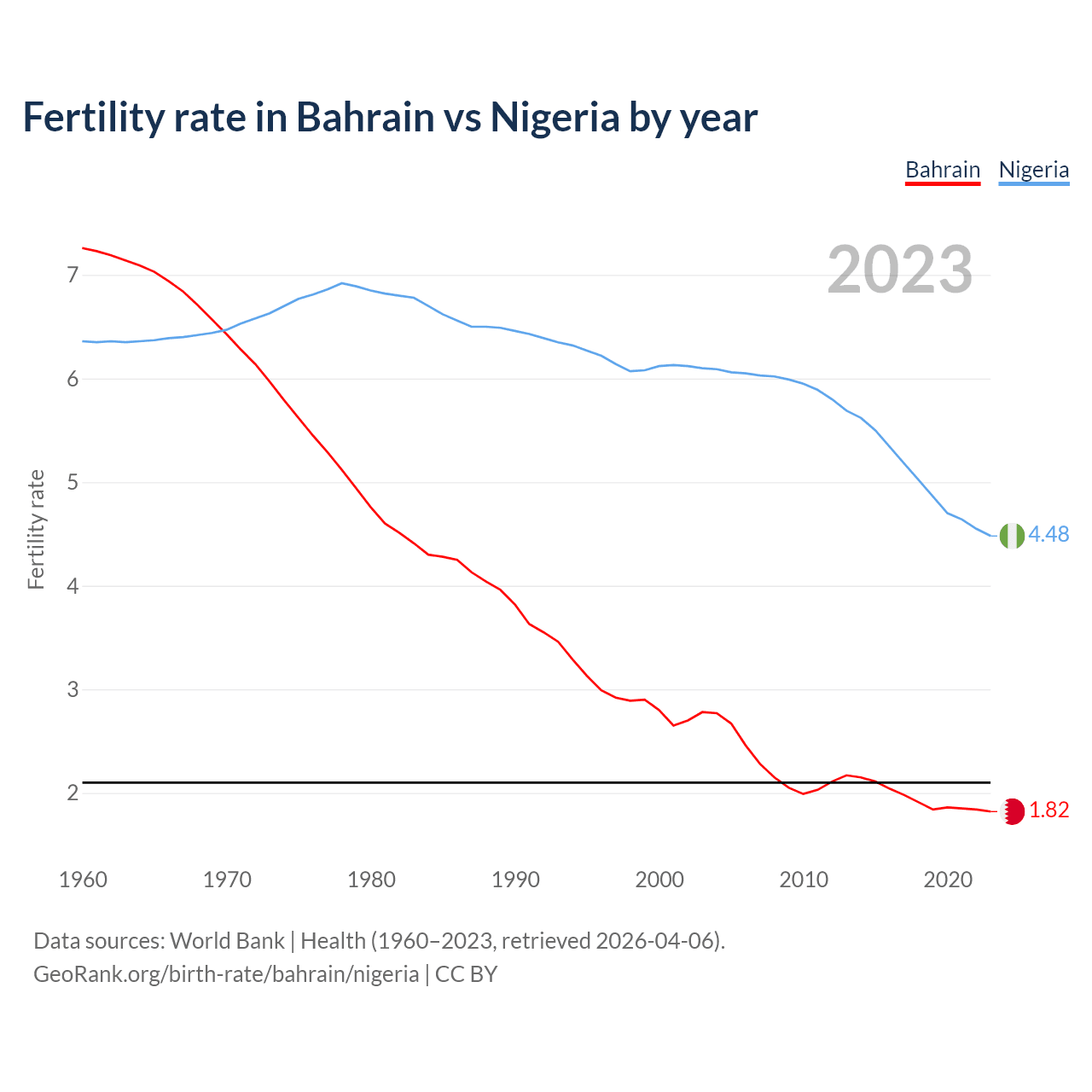 1960 vs 2023, the fertility rate has decreased by 74.9% in Bahrain and by 29.6% in Nigeria — in 1960, it was 7.26 and 6.36, respectively.