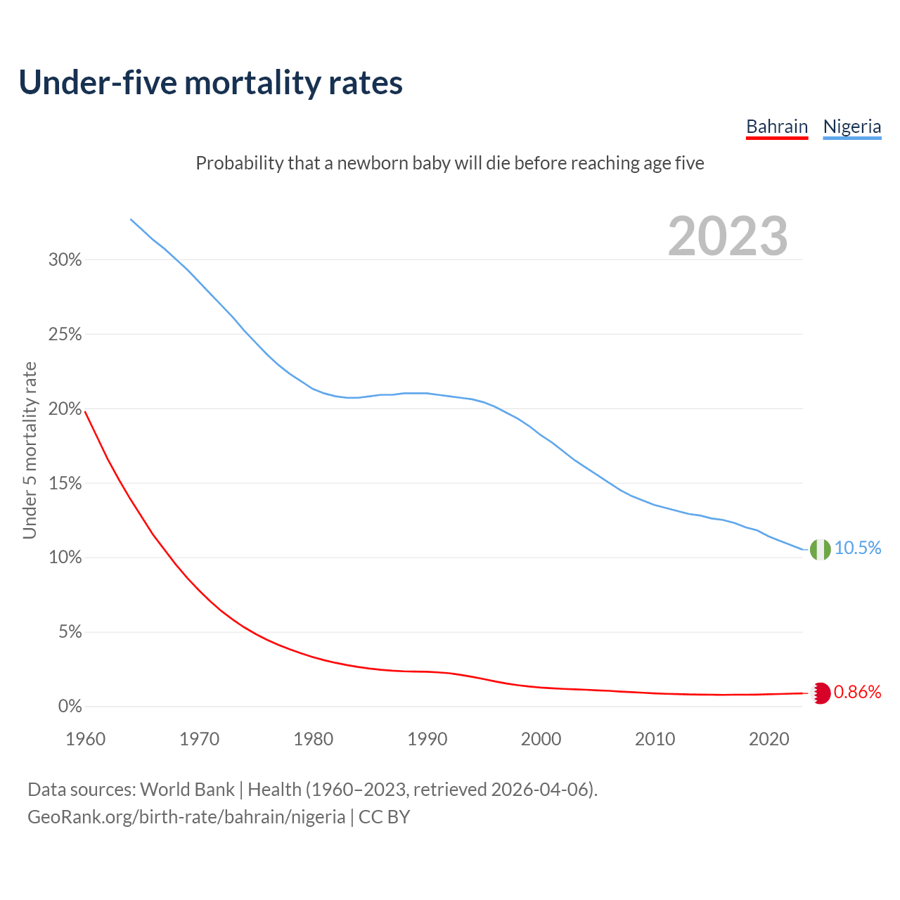 The chance that a newborn baby will die before reaching age five is 0.86% in Bahrain and 10.5% in Nigeria. Above is a chart with historical data on under-five mortality rates.
