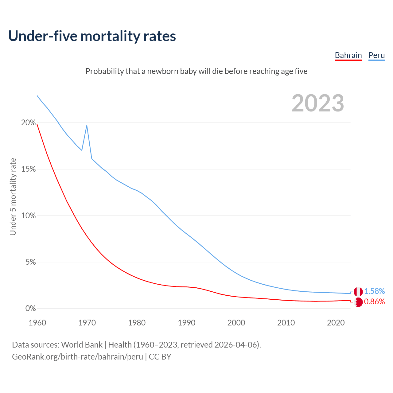 The chance that a newborn baby will die before reaching age five is 0.86% in Bahrain and 1.58% in Peru. Above is a chart with historical data on under-five mortality rates.