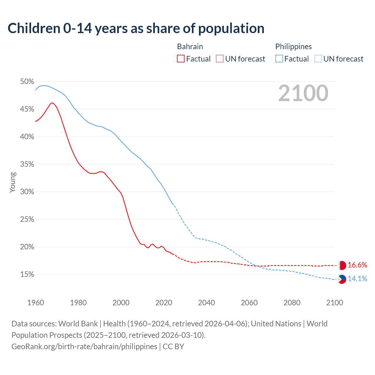 According to the latest available data on birth rates, the fertility rate in Bahrain was 1.82 children per woman in 2023, compared to 1.92 in the Philippines in 2023. The replacement level is considered to be 2.1 children per woman.