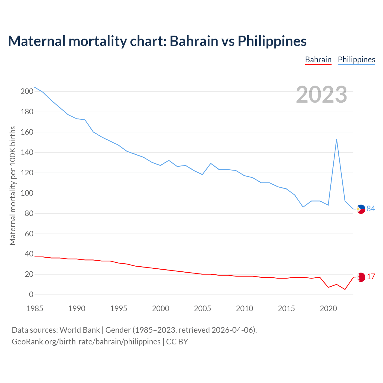 The maternal mortality rate, which is the probability of dying during childbirth or within 42 days of pregnancy termination, is 17 deaths per 100,000 live births in Bahrain, compared to 84 deaths in the Philippines.
