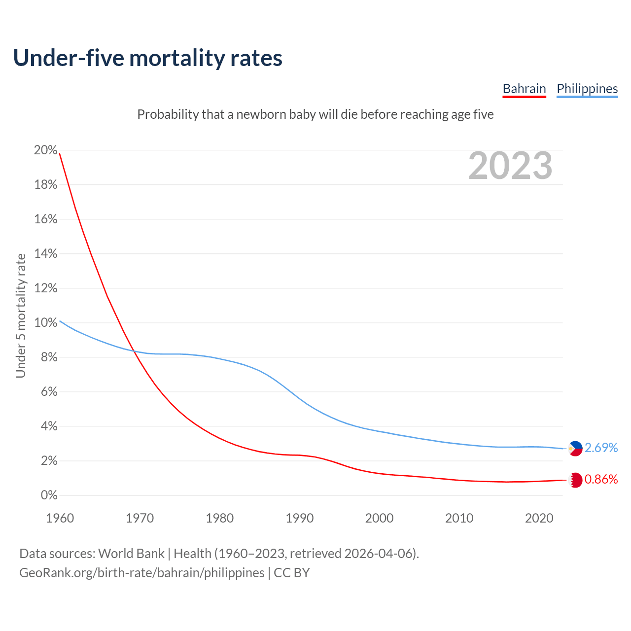 The chance that a newborn baby will die before reaching age five is 0.86% in Bahrain and 2.69% in the Philippines. Above is a chart with historical data on under-five mortality rates.
