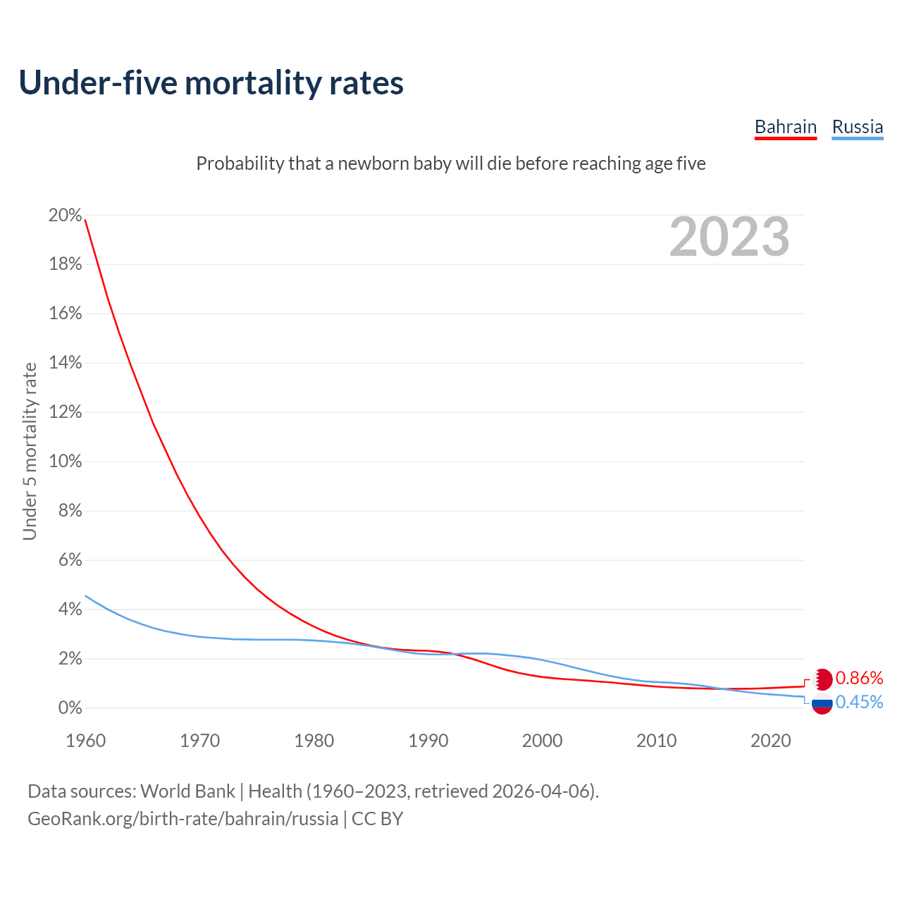 The chance that a newborn baby will die before reaching age five is 0.86% in Bahrain and 0.45% in Russia. Above is a chart with historical data on under-five mortality rates.