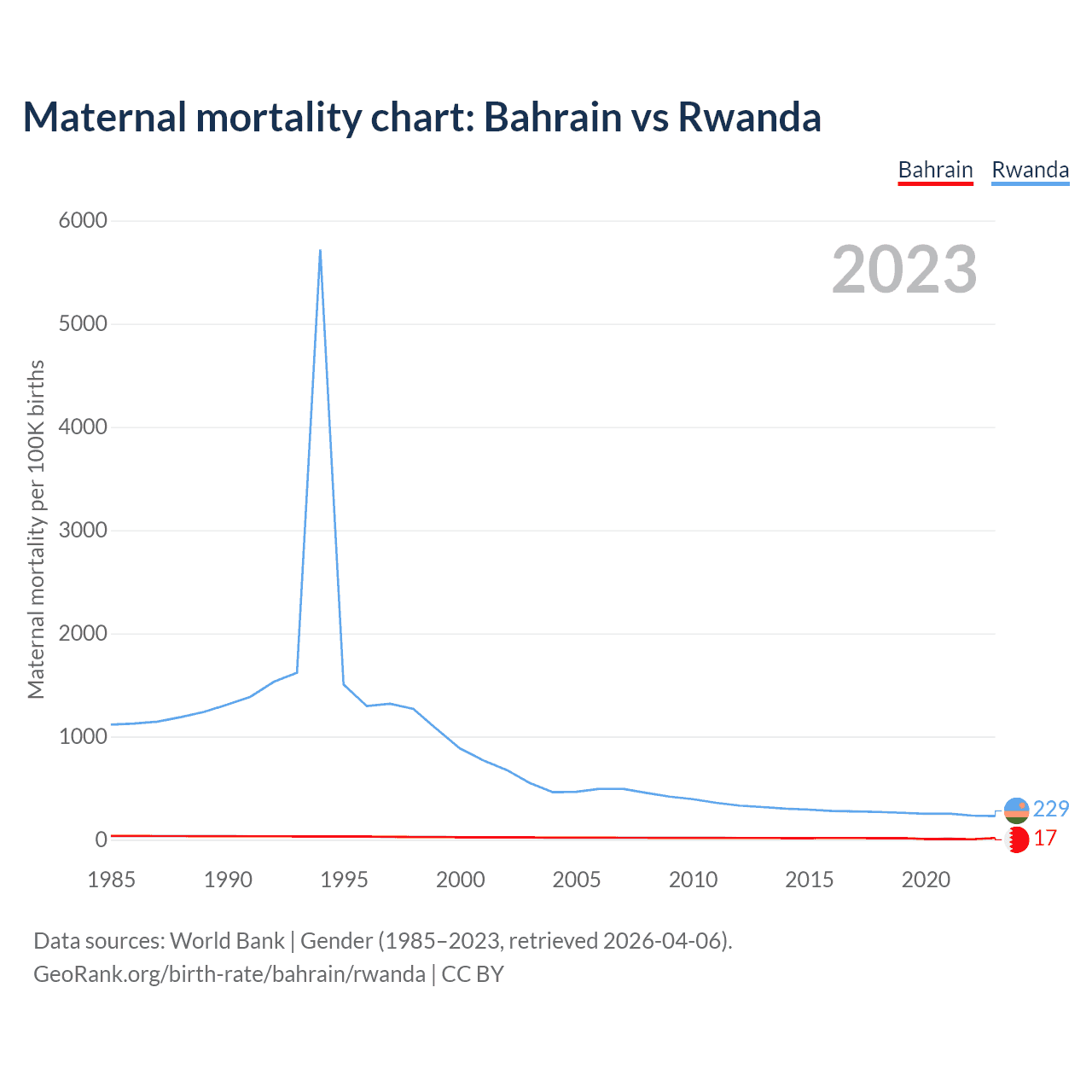 The maternal mortality rate, which is the probability of dying during childbirth or within 42 days of pregnancy termination, is 17 deaths per 100,000 live births in Bahrain, compared to 229 deaths in Rwanda.