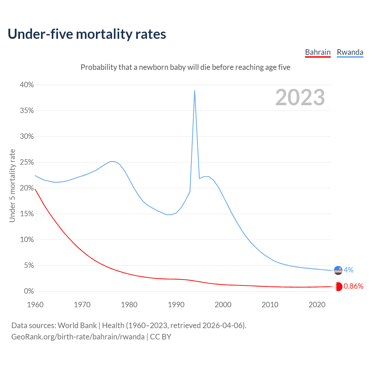 The chance that a newborn baby will die before reaching age five is 0.86% in Bahrain and 4% in Rwanda. Above is a chart with historical data on under-five mortality rates.