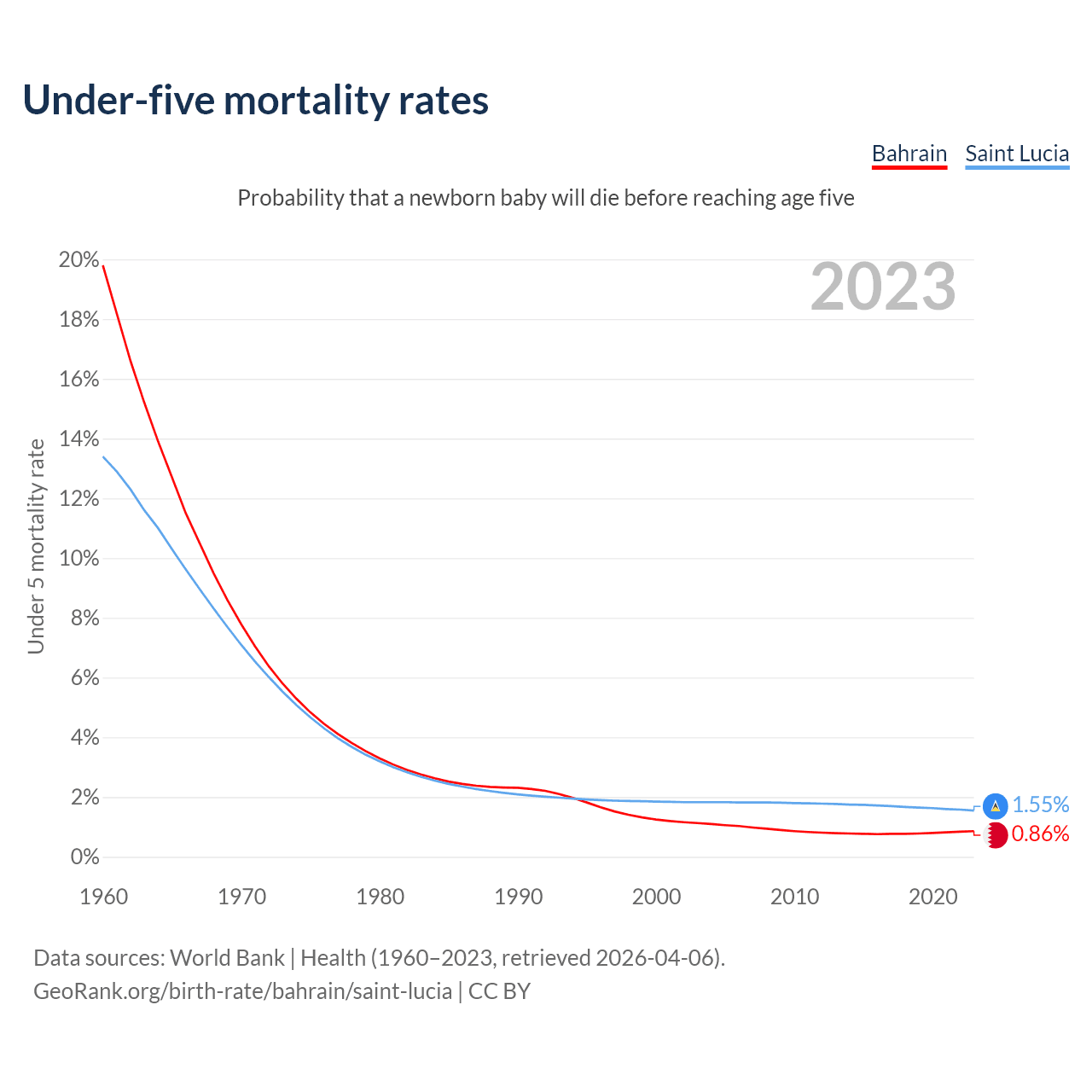 The chance that a newborn baby will die before reaching age five is 0.86% in Bahrain and 1.55% in Saint Lucia. Above is a chart with historical data on under-five mortality rates.
