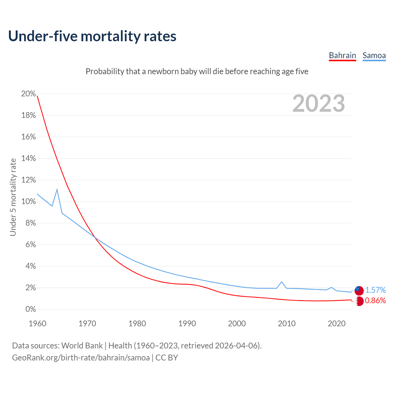 The chance that a newborn baby will die before reaching age five is 0.86% in Bahrain and 1.57% in Samoa. Above is a chart with historical data on under-five mortality rates.