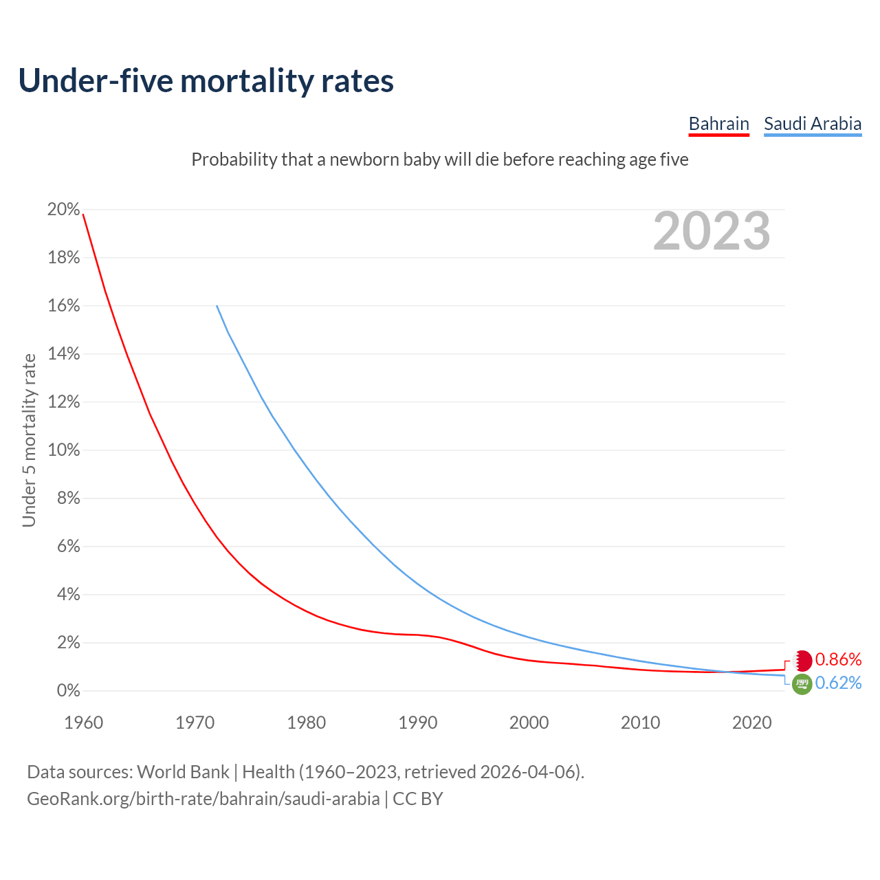 The chance that a newborn baby will die before reaching age five is 0.86% in Bahrain and 0.62% in Saudi Arabia. Above is a chart with historical data on under-five mortality rates.