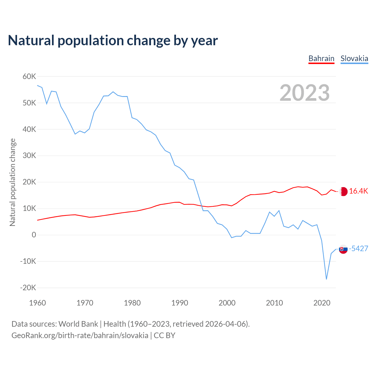 Bahrain has an annual birth rate of 12.5 births per 1,000 people, compared to 9 for Slovakia. The average number of children a woman is expected to have during her lifetime — the fertility rate, is 1.82 in Bahrain and 1.49 in Slovakia — 18.3% difference.