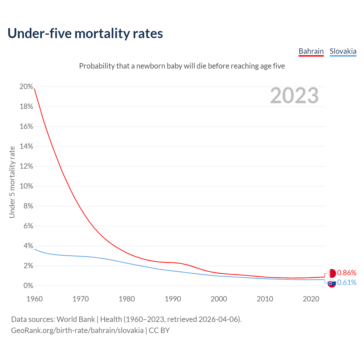 The chance that a newborn baby will die before reaching age five is 0.86% in Bahrain and 0.61% in Slovakia. Above is a chart with historical data on under-five mortality rates.
