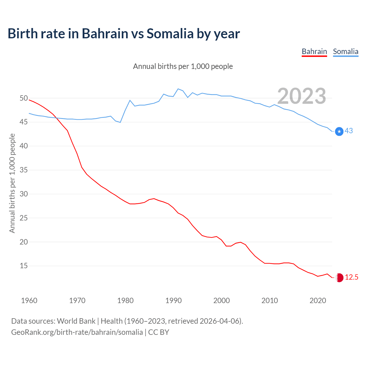 Bahrain has an annual birth rate of 12.5 births per 1,000 people, compared to 43 for Somalia. The average number of children a woman is expected to have during her lifetime — the fertility rate, is 1.82 in Bahrain and 6.13 in Somalia — 236.2% difference.