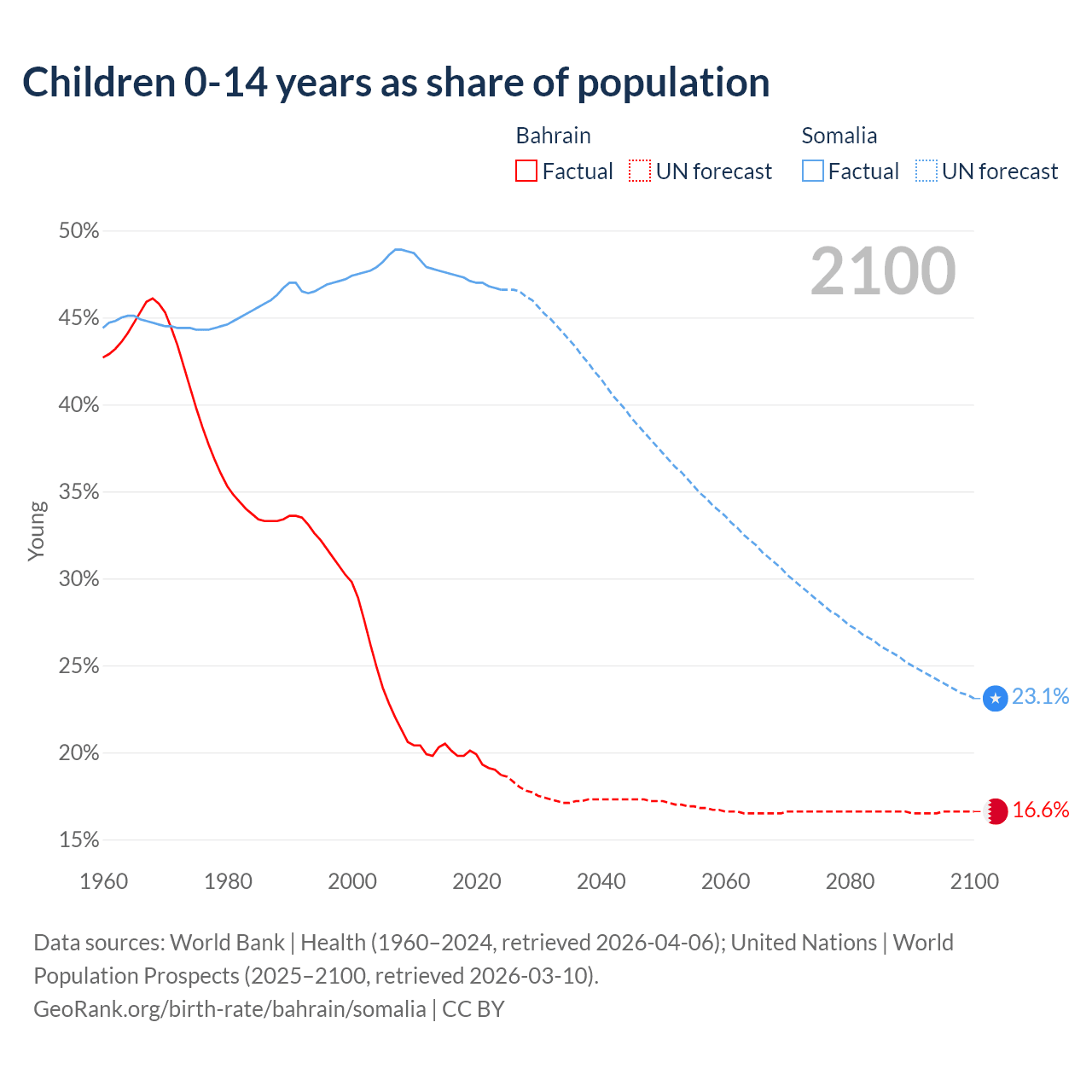 According to the latest available data on birth rates, the fertility rate in Bahrain was 1.82 children per woman in 2023, compared to 6.13 in Somalia in 2023. The replacement level is considered to be 2.1 children per woman.